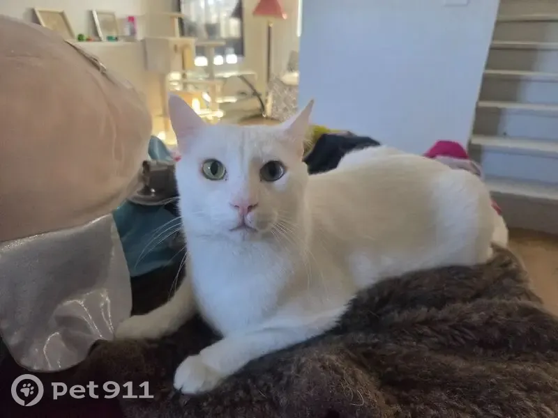 My cat, Thor, is completely white and short-haired, with one blue eye and one green eye. He is very friendly and laid-back; he is neutered and microchipped, though the microchip information is registered in Colombia. He is an indoor cat who escaped from the house last night—I didn't notice until today.
