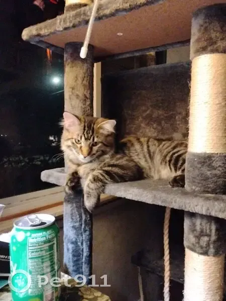 Brown areas around ears and face, remainder of coat silvery/grey and black mackerel tabby. Long hair over the ears, on chest and a poofy tail. Can be timid and a bit spicy. He is an indoor only kitten 5 mos of age that escaped via an open door when I was bringing in groceries. He does answer to his name.