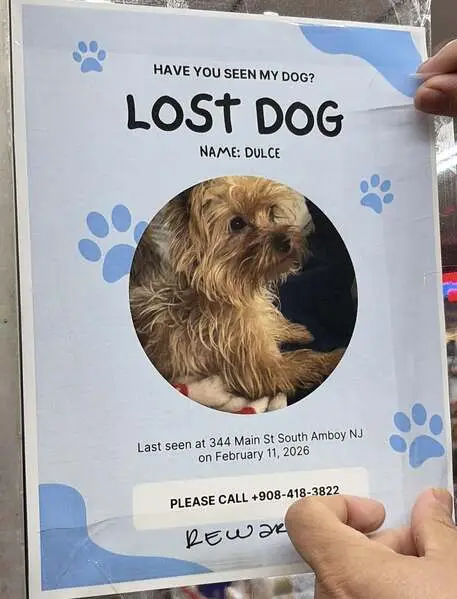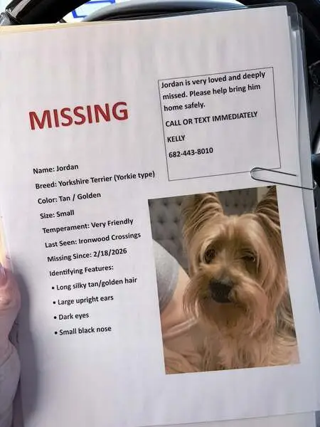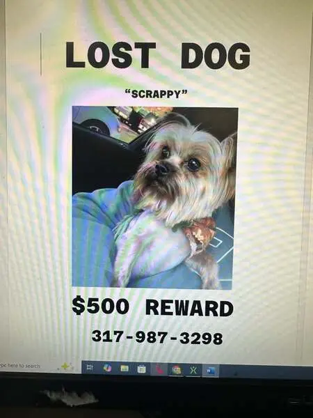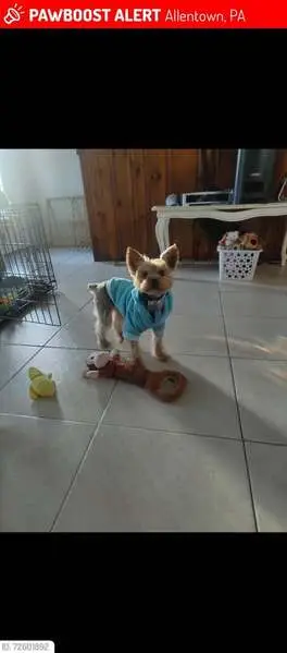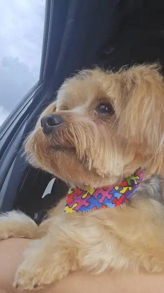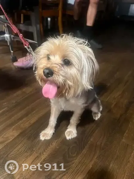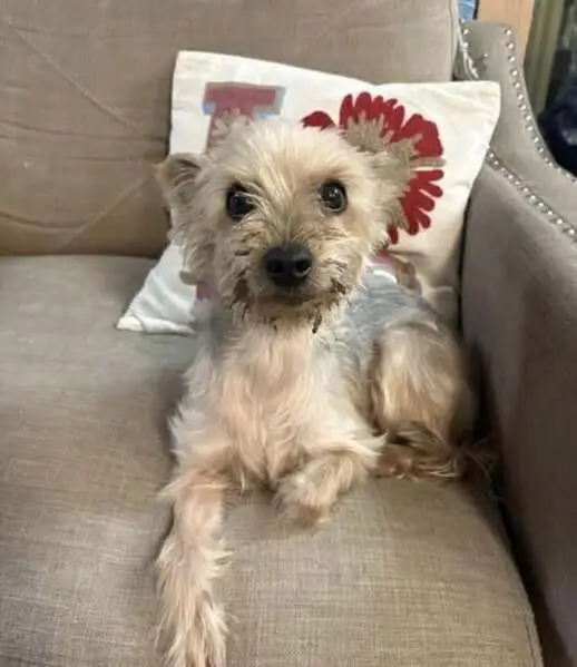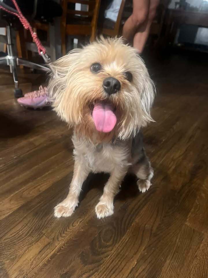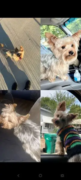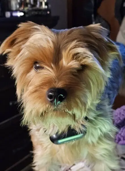 A small male dog, possibly a Yorkie or a mixed breed, with distinctive coloring: a tan face and paws and a mostly gray body. He has a green collar and a cut blue leash but no microchip.