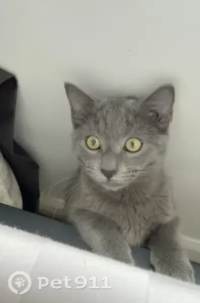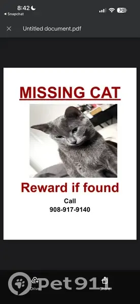 She is all grey with grey yellow eyes, she has a swinging belly, she is pretty small, and really friendly she is an indoor kitty so she is probably really scared