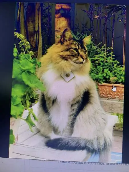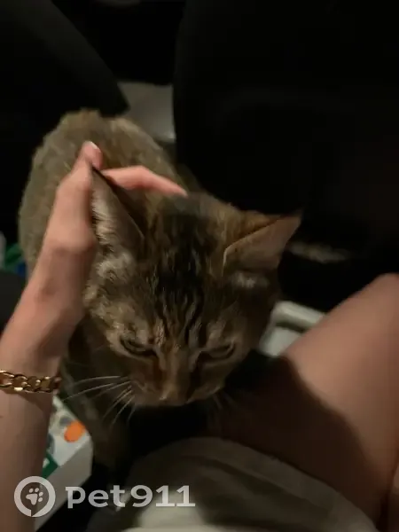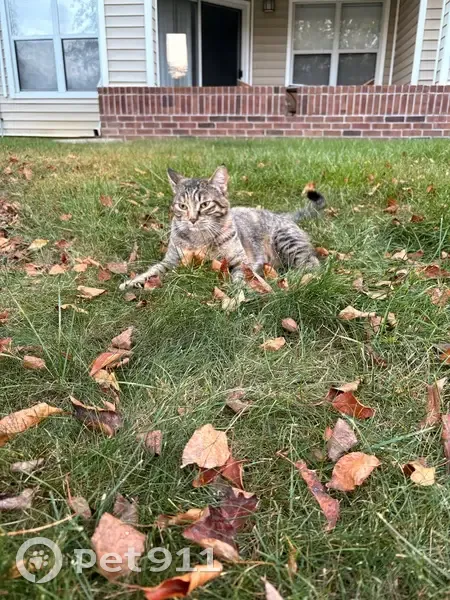 This cat has brown/tan/cream fur. Mostly lighter fur on the belly. It also has brown/black stripes on all 4 legs and tail. It has a brown/black mark next to its right eye. A very sweet and friendly cat