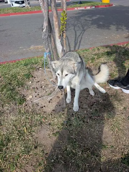 Orion took off with his cable attached, blue collar and a teal harness. He is very friendly and likely to come to a stranger. He looks like a wolf has a scar on his face and some scars on his legs from his previous life. We adopted him about a month ago.