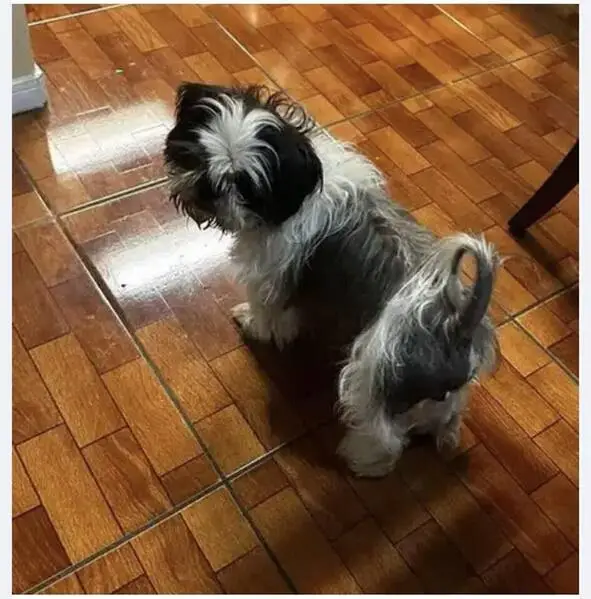 She has white and black hairs. She had puppies and she was nursing till now. She has a funny hair cut right now because she was nursing. Her body hair is long but other parts are very short.