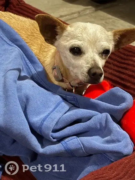 Tan Chihuahua . Seems old and possibly partially blind and hard of hearing .. Very scared and timid. Have this baby in my garage.. Gave it a bed and I’ve been feeding it .. Please help me find its owners