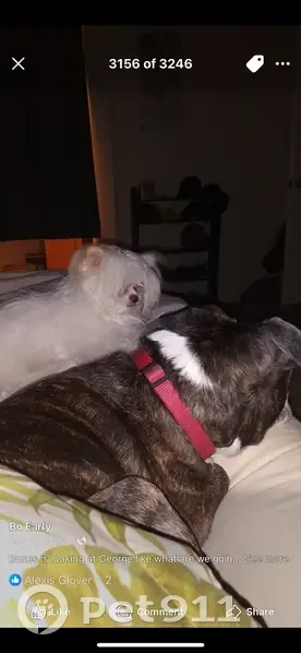 Brindle coloring with white around the collar area he s 16 yrs old and has a tumor on his belly area he has a hard time hearing and hates being outside. He’s very friendly