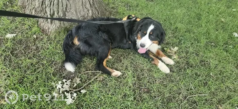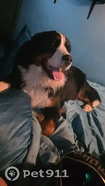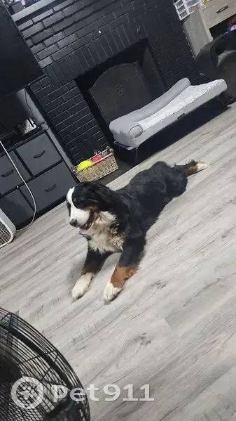 She is a bernese mountain dog wearing a purple collar. She got out of a fenced back yard at the address listed but has resided in Connersville indiana for the last 7 months. If you say her name in a peppy voice she usually comes! She is scared of people she doesn't know but good with kids and other dogs. Likes people food. She's always been an indoor dog never strayed far when outside.
