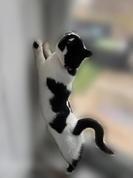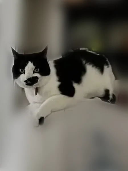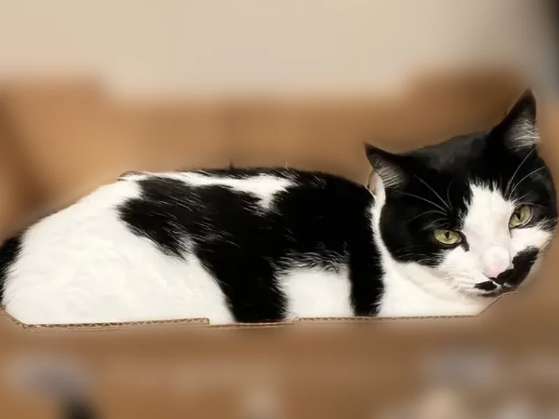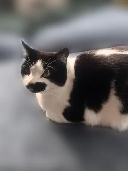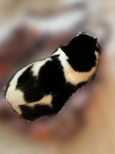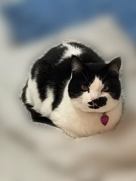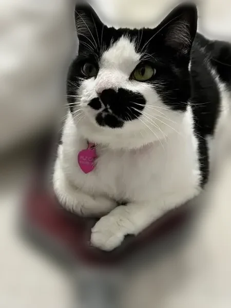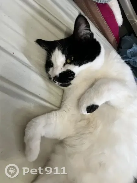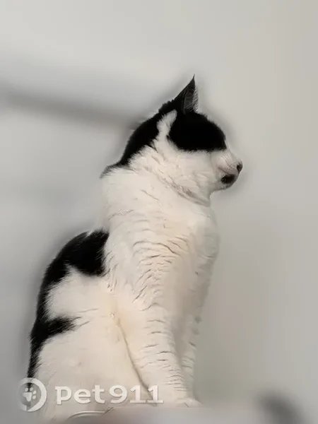 Looks like a cow with a half mustache! Mainly white with large black spots all over her and an all black tail. She escaped right out our front door (she’s always been an inside cat)