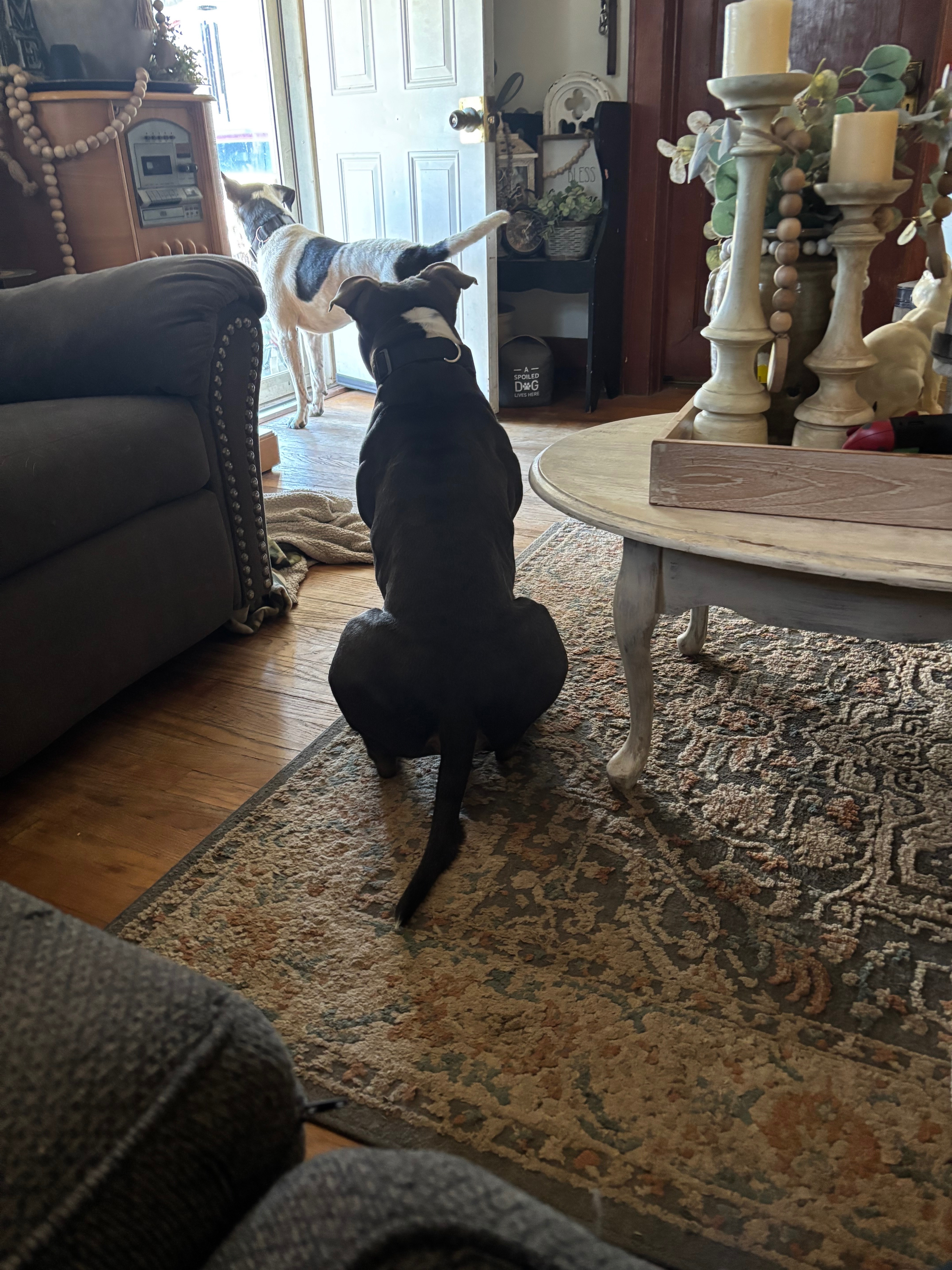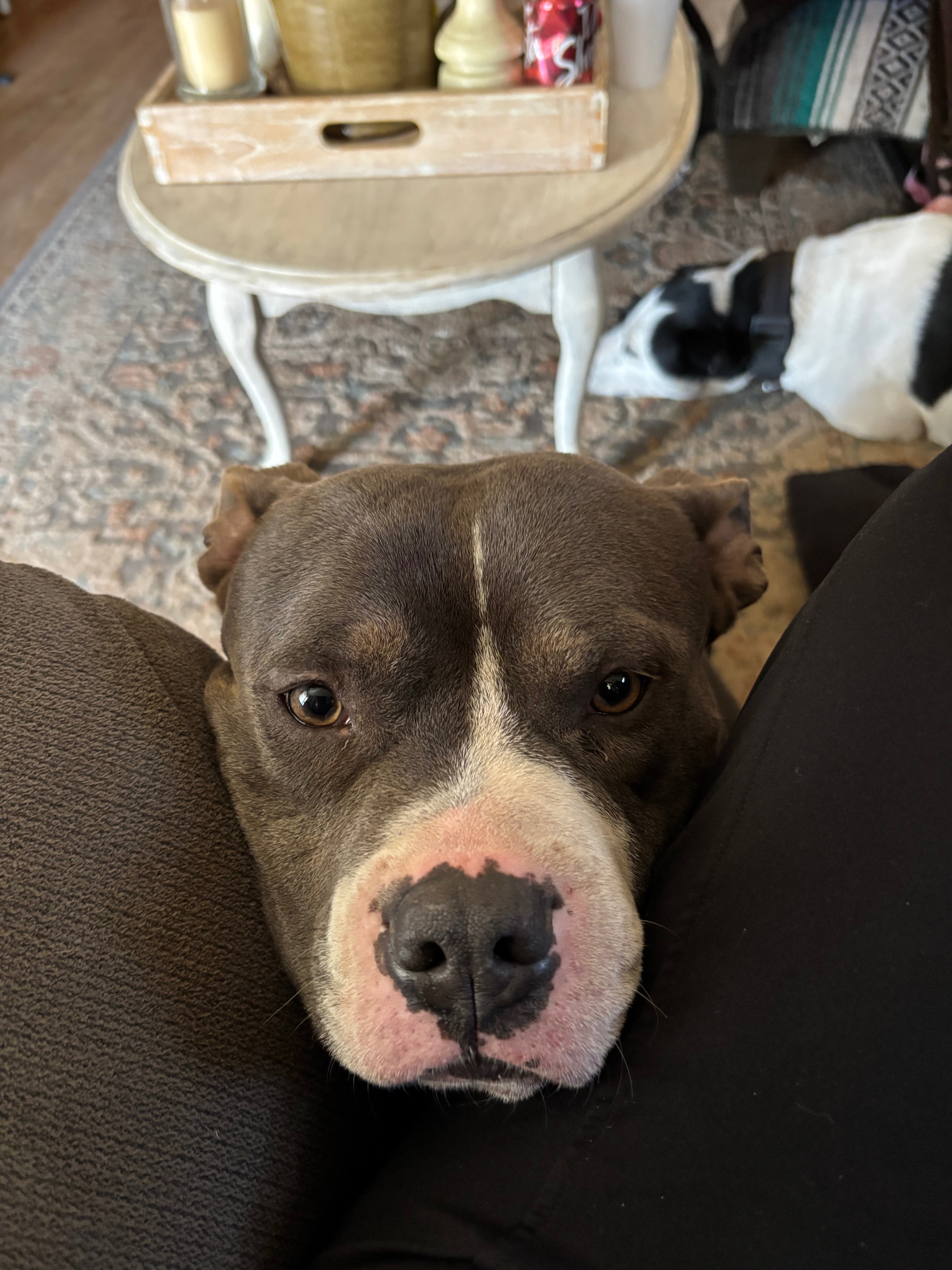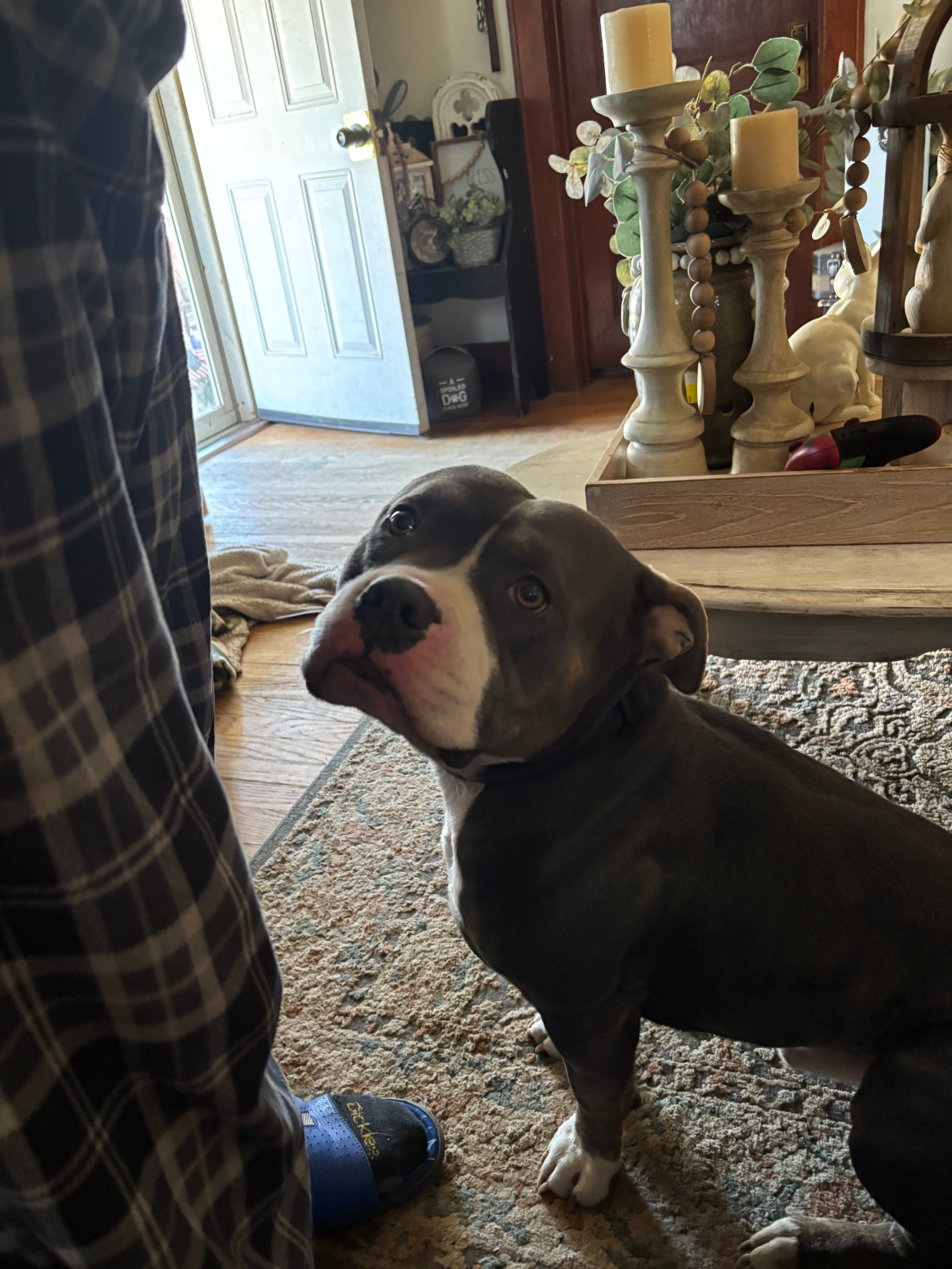 Blue, has a small white line on his forehead, has a little bit of white on his chest, has white on his paws, He was wearing a black collar with no tags. He’s short and stocky.