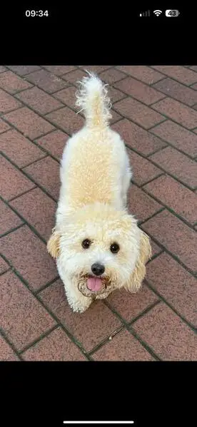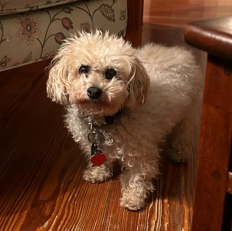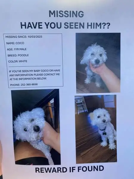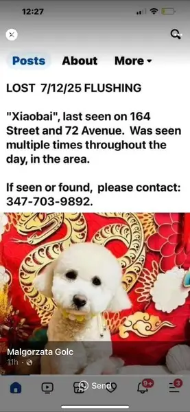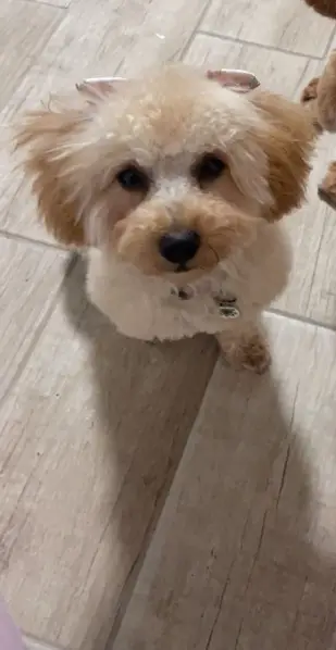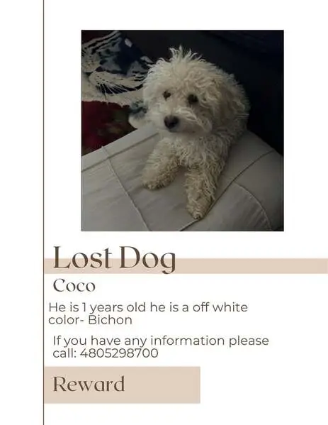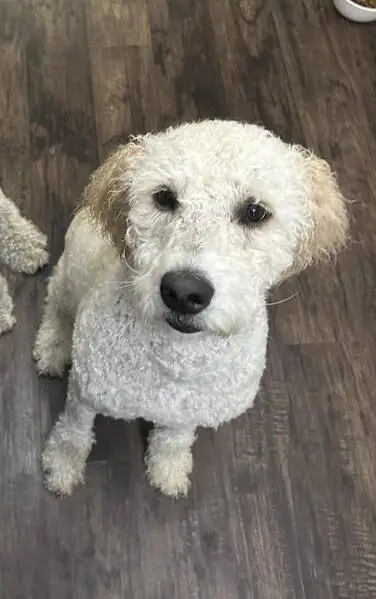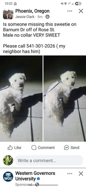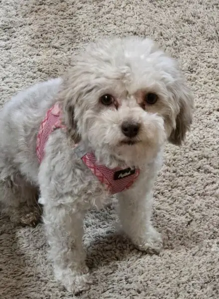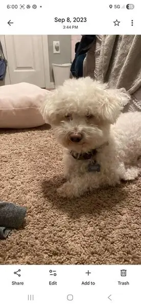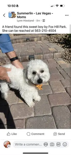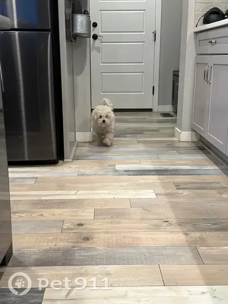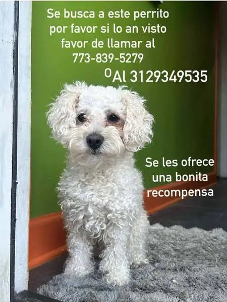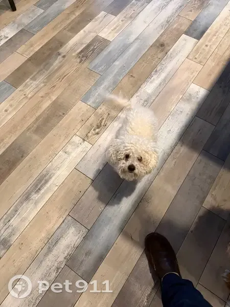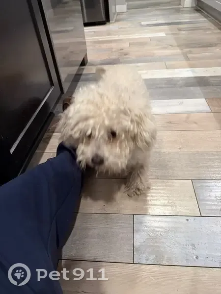FOUND DOG — ERIE, COLORADO Last night at 9:15 p. M., my son and I found a small female dog near Erie Middle School, at the corner of Main Street and Wells Street. She had wandered into traffic and nearly got hit by a car. She was scared, it was dark and getting cold, so we brought her to safety. She is an all-white female dog with distinct brown markings under her eyes. She weighs roughly 10–12 pounds, has mostly curly hair, and a full tail. She appears to be well-groomed and well-cared for, so we believe she has a family looking for her. If this is your dog or you recognize her, please reach out so we can get her home safely.