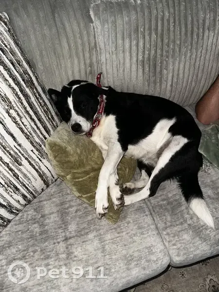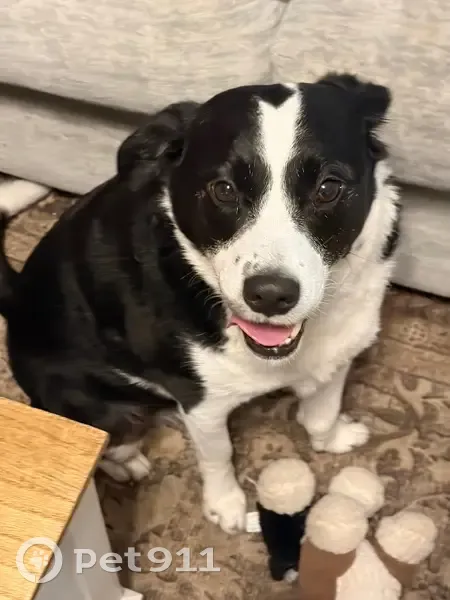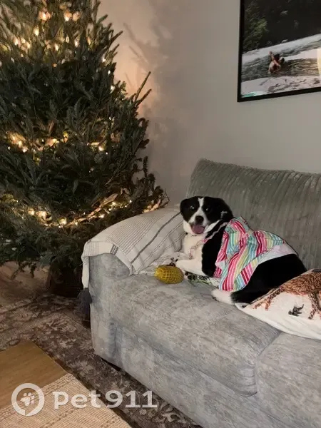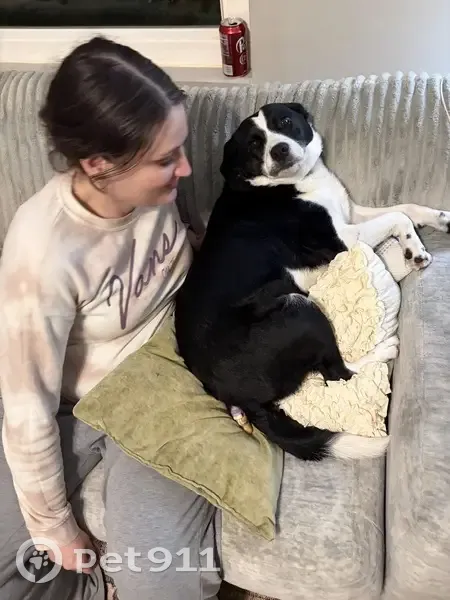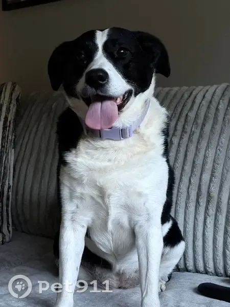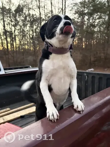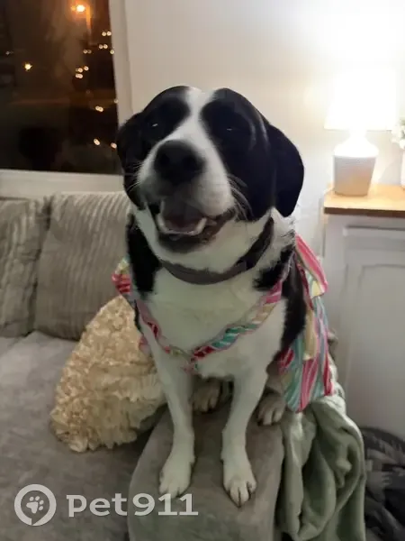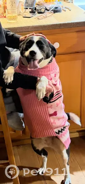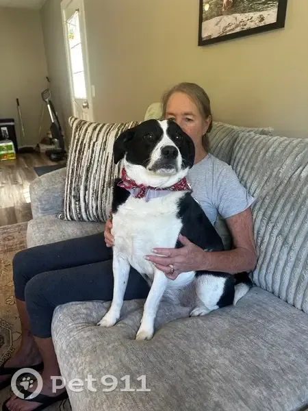 Black and white. 7 y/o. Friendly. Will get in your car. Loves rides. Knows commands. Registered emotional support animal.
