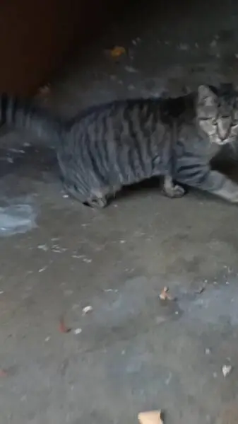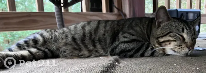 Grey and tan male tabby. Very friendly and vocal. Has damaged ear. Climber! Scaled or very high back porch. Someone's really missing this one!