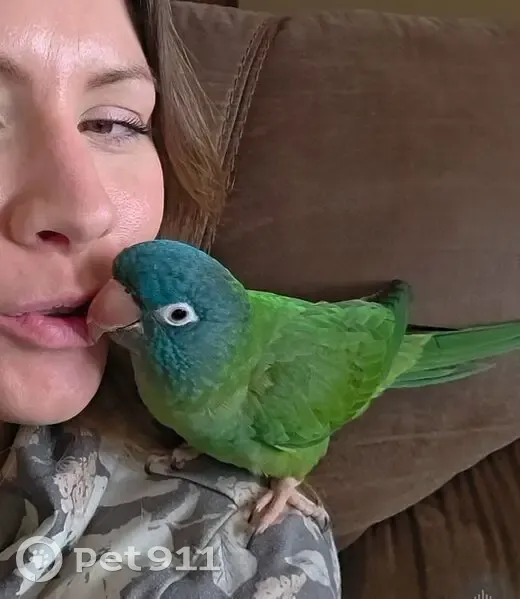 Green, with blue on his head, and tip of his flight wings. White ring around his eyes. He flew away outside, got real high, did 4 big loops then we couldnt see him anymore. He is a total mamas boy and probably so scared!