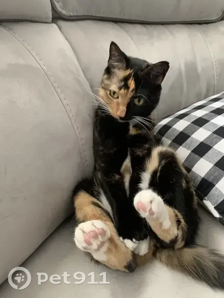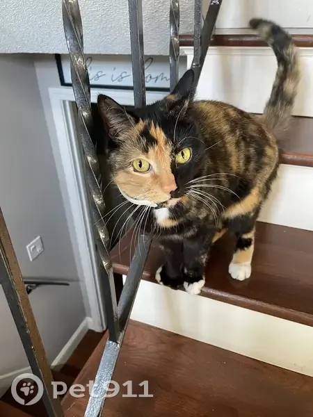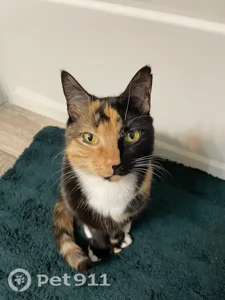 Picasso is a black and orange calico with a half orange and half black face, white paws, and yellow-green eyes. She is polydactyl. Her left ear has a chipped scar from when she was younger. We found her collar in a wooden area that is part of a neighbor’s yard. She is 8 years old and is an indoor and outdoor cat, but she’s never been gone for more than a day. She got out of the house during a party on October 27th and the air tag last tracked her at 2:24 am on Josephine Dr. Off of Sidney St. In Fall River.