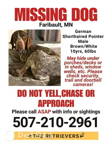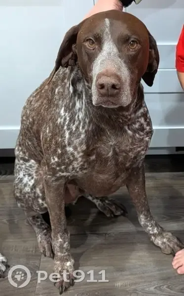 German shorthaired pointer. Body is mostly brown with white fleck, has a solid brown head with white snout and white marking that goes up between eyes, off center to right. Has a solid brown patch right above tail. Medium to large size dog. 29" height (paw to shoulder), 70ish lbs. Large chest. No collar.