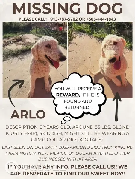 Missing dog Farmington, photo: Lost Shy Dog Arlo: Blond Curls, Brown Eyes