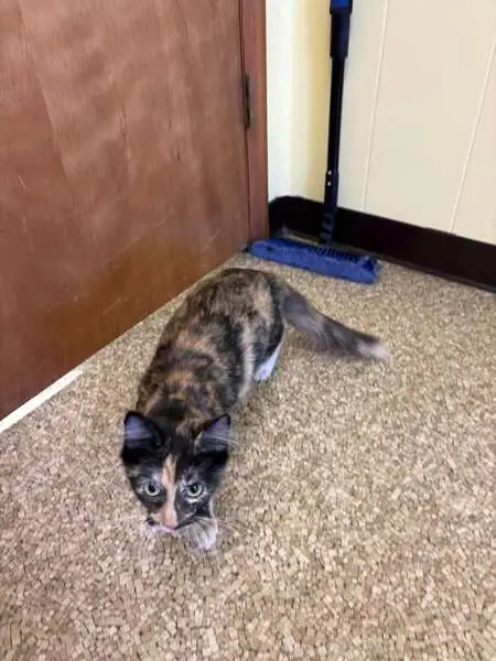 Tortoiseshell cat of medium size. Green eyed. She doesn’t like people but won’t scratch or bite. Recently moved and let my cat out to soon as she is a outside/inside cat.