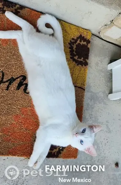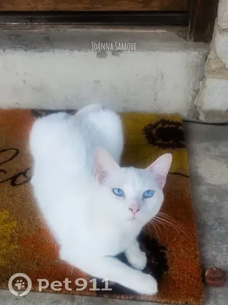White Dawg is a female cat, pure white with blue eyes. Around one and a half years old. She is very affectionate and she loves to be petted. She just moved in with a new family, a few days later she ran outside and never went back. She must have got lost in the new neighborhood.