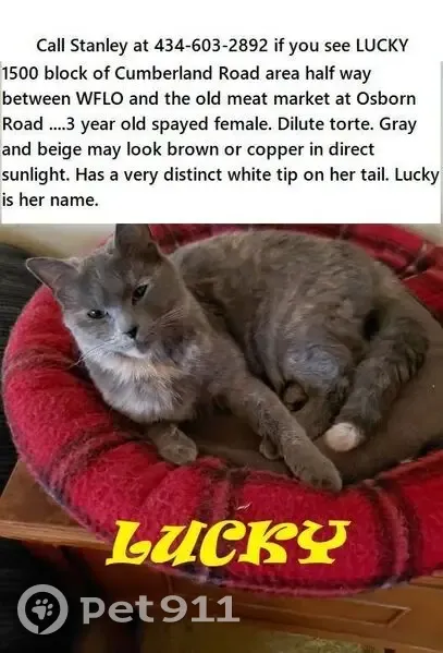 Gray and tan splotchy. One ear is tan on the top of her head, I think it is the right ear. A very distinct white tip on her long tail. 3 year old Spayed Dilute Torte. Very active and playful. Was a rescued kitten. On Sunday after a week end snow storm Lucky went for a routine bathroom break at 10:30 AM and never returned. She was always excited to interact with a few of the local strays which I always thought she may have been related with.