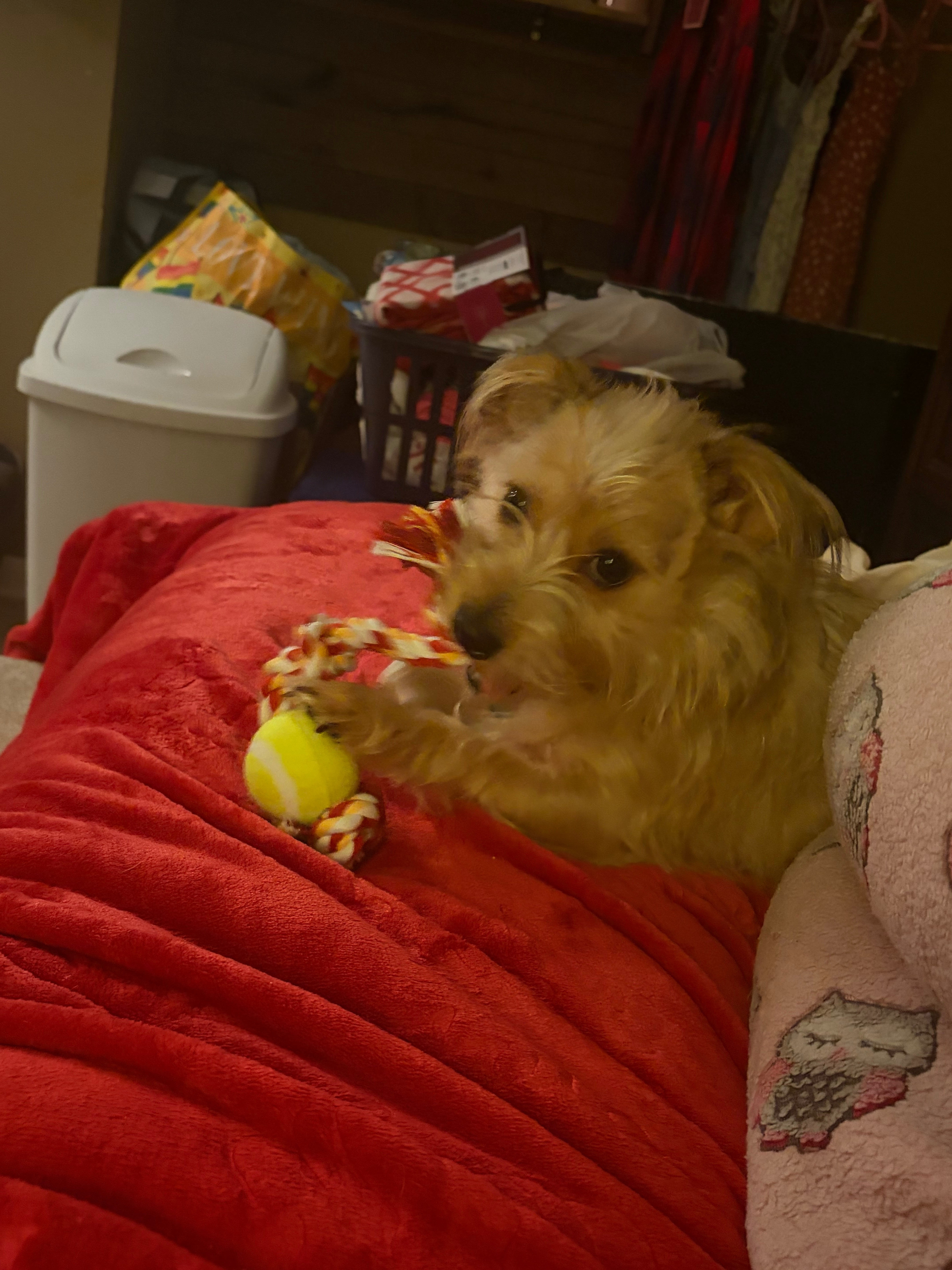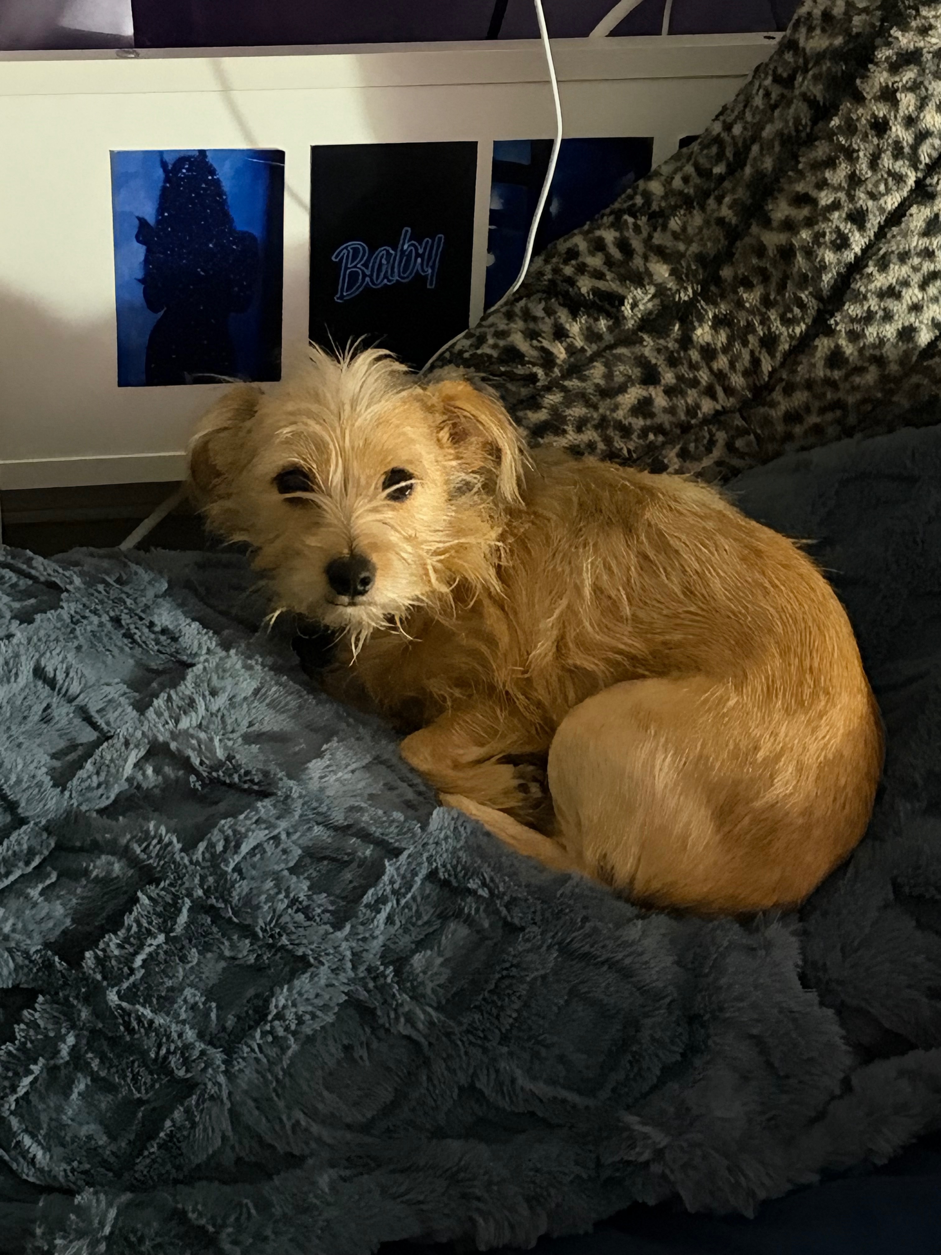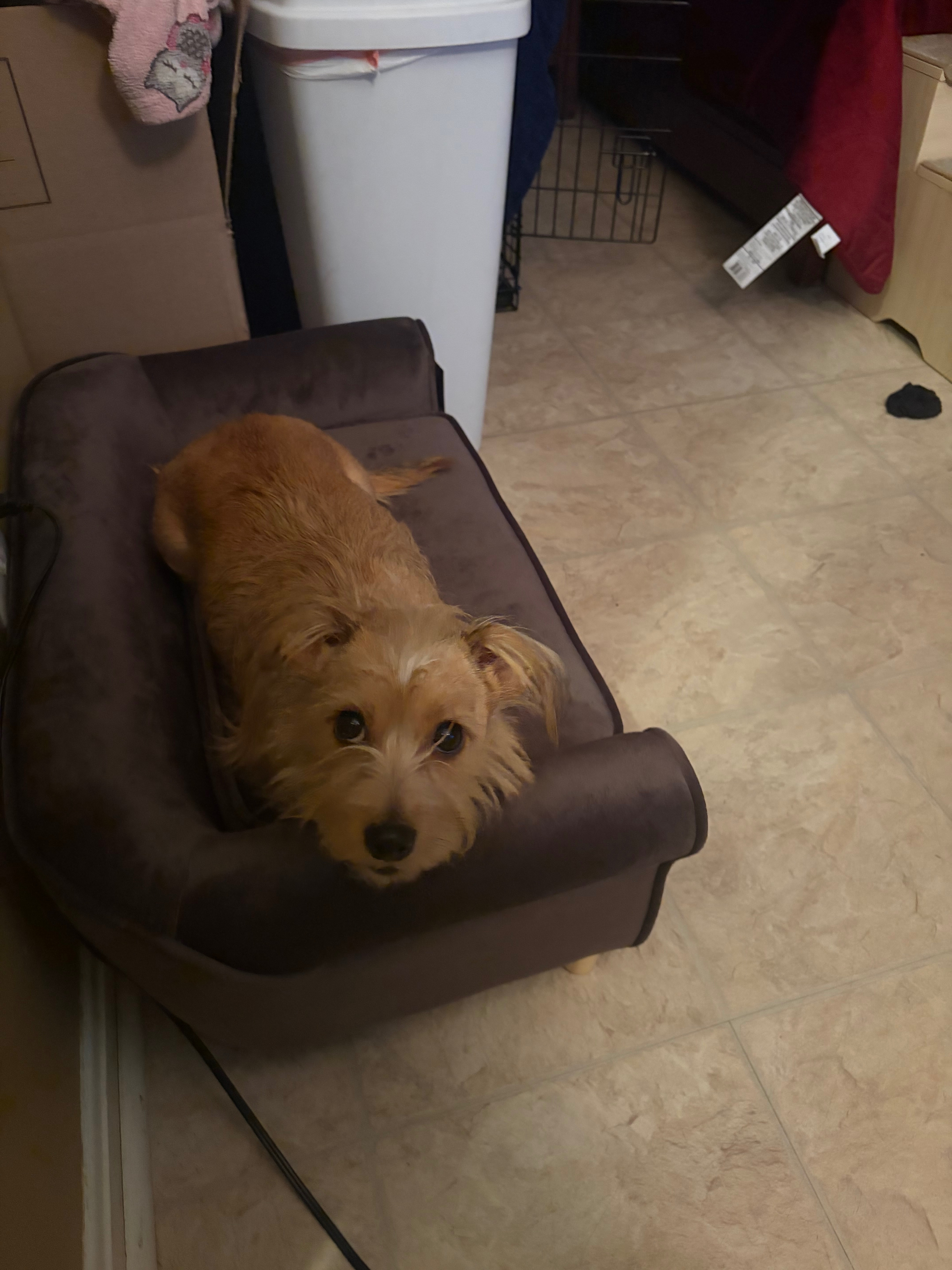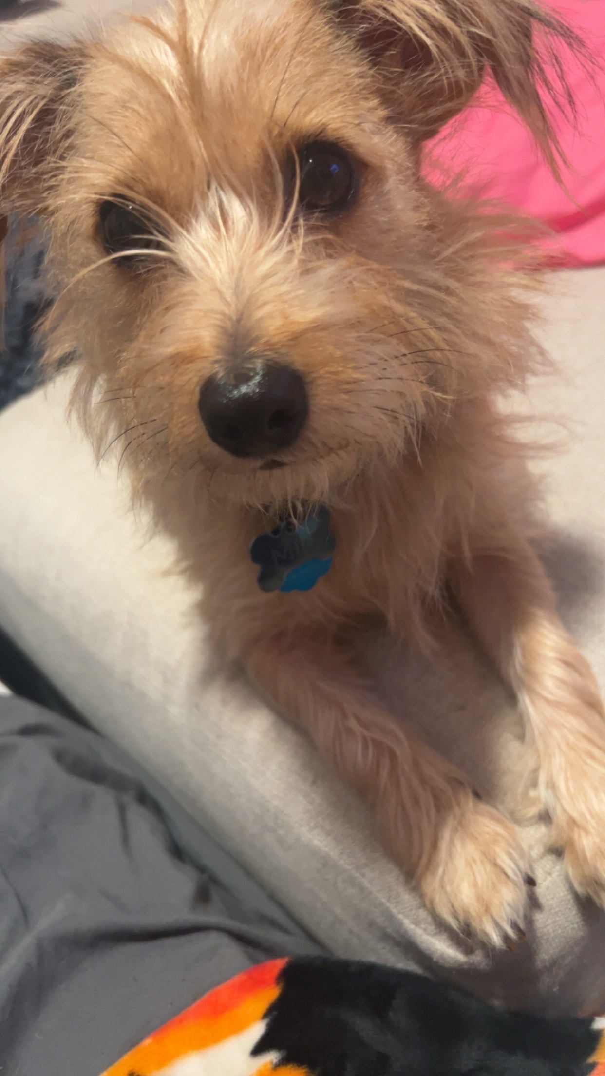 Tan/yellow dog. Rat terrier chihuahua mix. He has a blue collar on with dog tag that has my information. Address is not up to date. If returned to tht address i can still grab him. He is neutered. Do not run at him. Call me if seen!!!