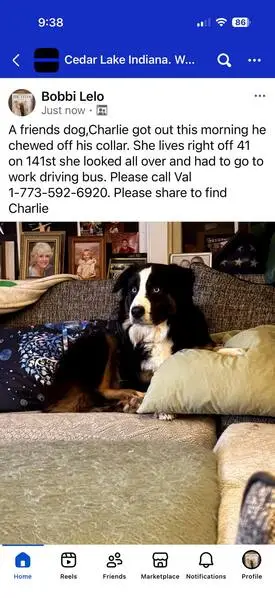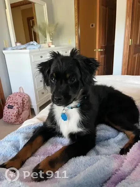 A little bit bigger he tends to have one of his ears flipped back (not always) small mostly black has a white patch on his back kind of behind his collar and black tail with a withe tip his chest is white