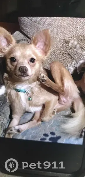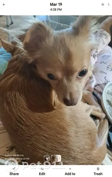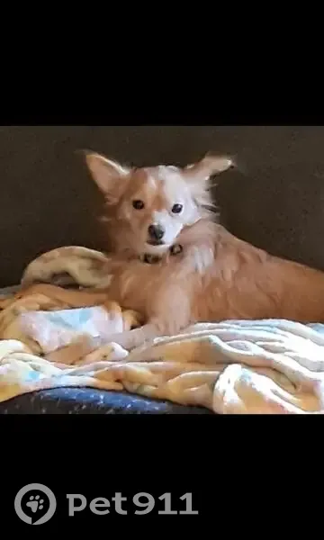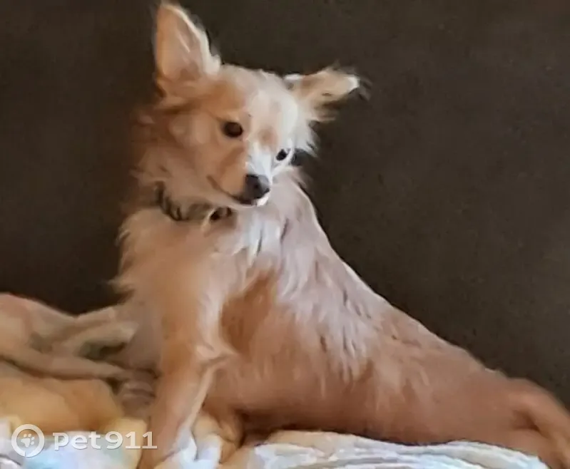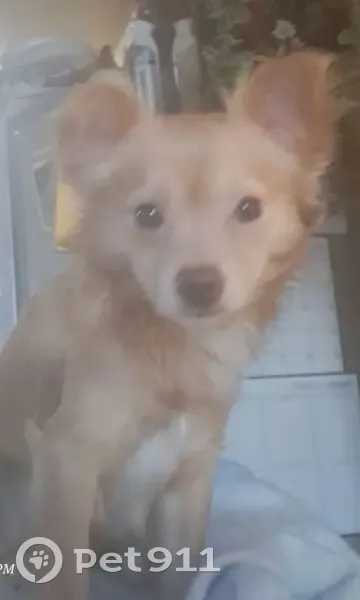 White cream color, fuzzy hair on ears, around the neck and his tail fans out ( hair) he is scared of strangers, but friendly. Neutered and microchip. Has a dark collar on, but hard see it cause of his thick hair around neck. Chiuauaha mix, around 10 pounds
