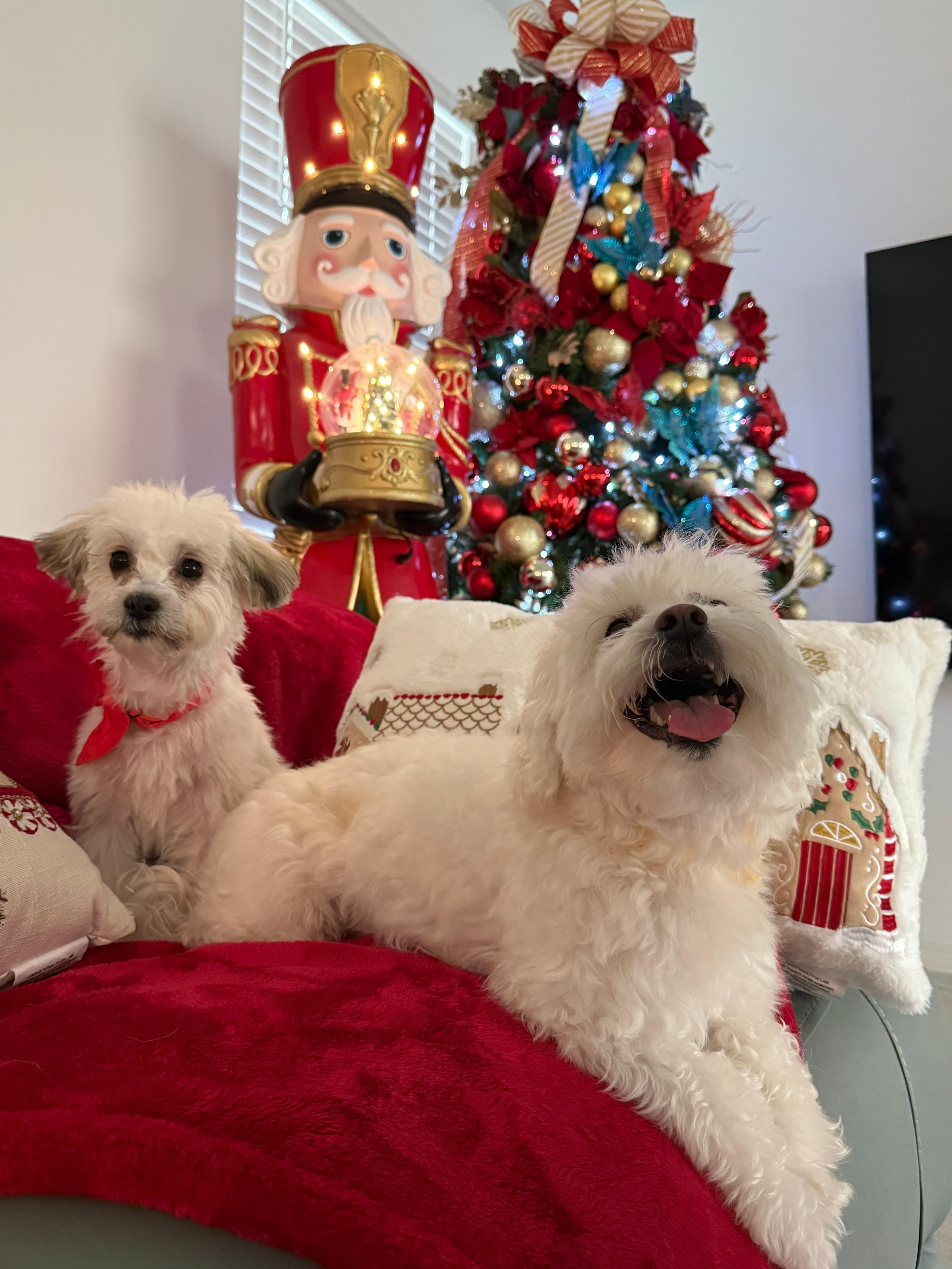Puppy (about 10lbs) and 4 month old. He has a Christmas sweater (same as the picture), he also has a blue collar. Right at new hears eve he took off running- hw was scared of the fireworks