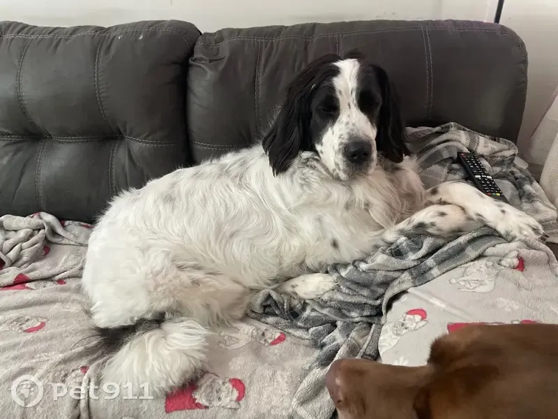 Newfoundland, fluffy, over 100 lbs, mostly white, black face and black butt, blended spots. Very timid and shy, got out thru hole in fence with other dog. Dogs got separated , other dog made it home.