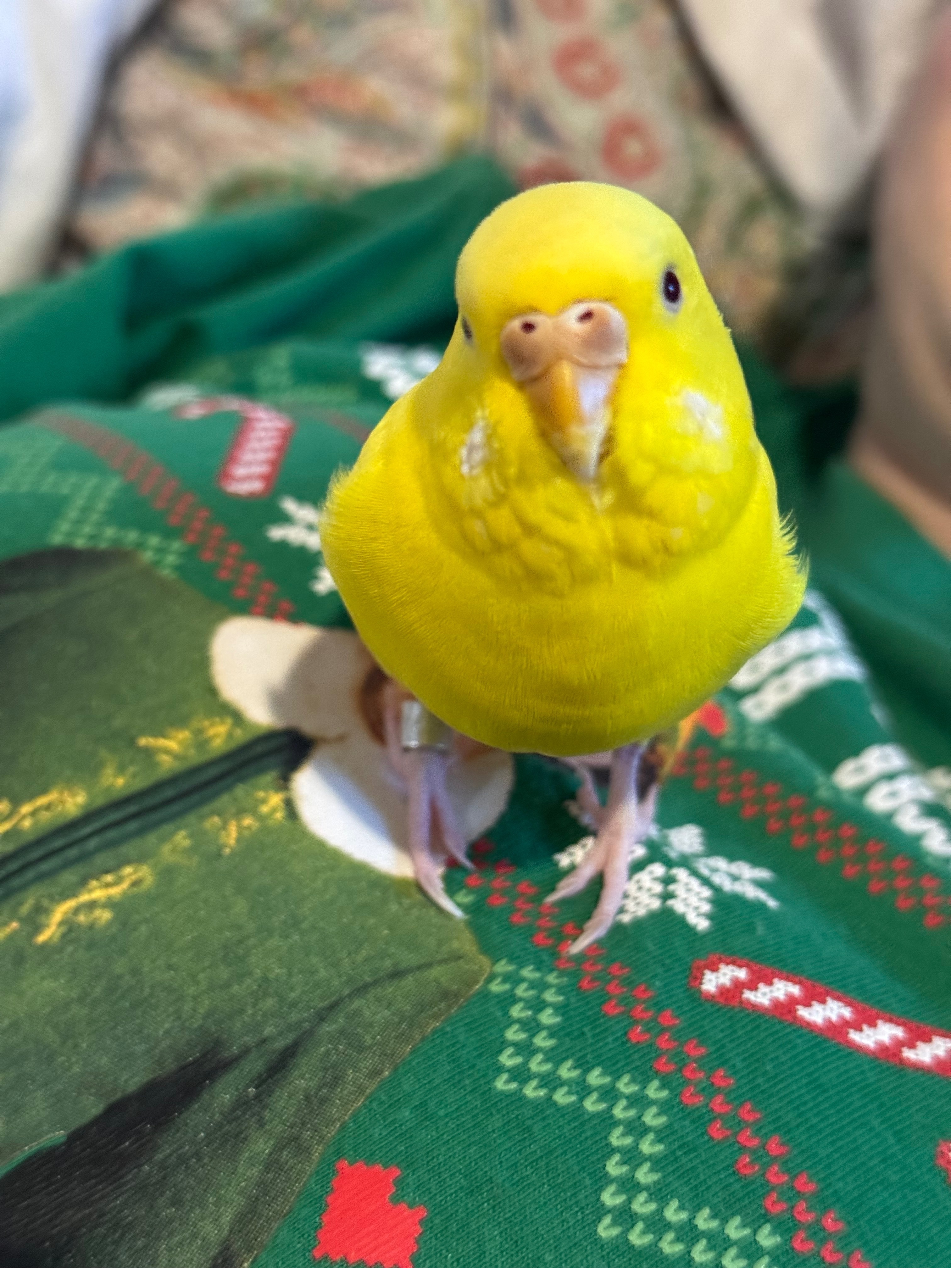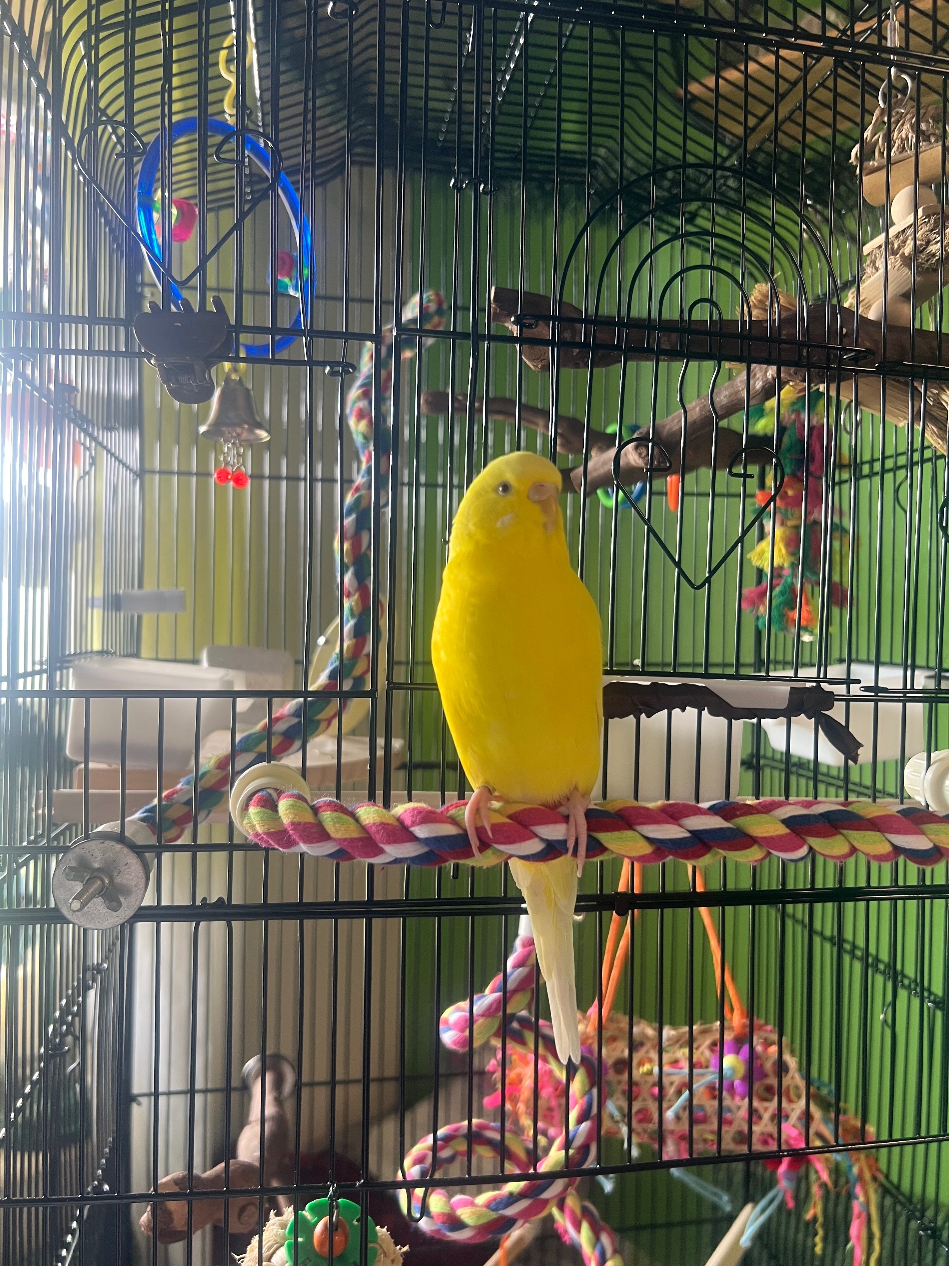 Beautiful tiny yellow budgie. She has white cheeks. She can wolf whistle and step up. She was being watched by friends while we were on vacation. Escaped the cage somehow and we hope she escaped the dogs and got out… her wings were clipped but not super short. Band on her right leg.