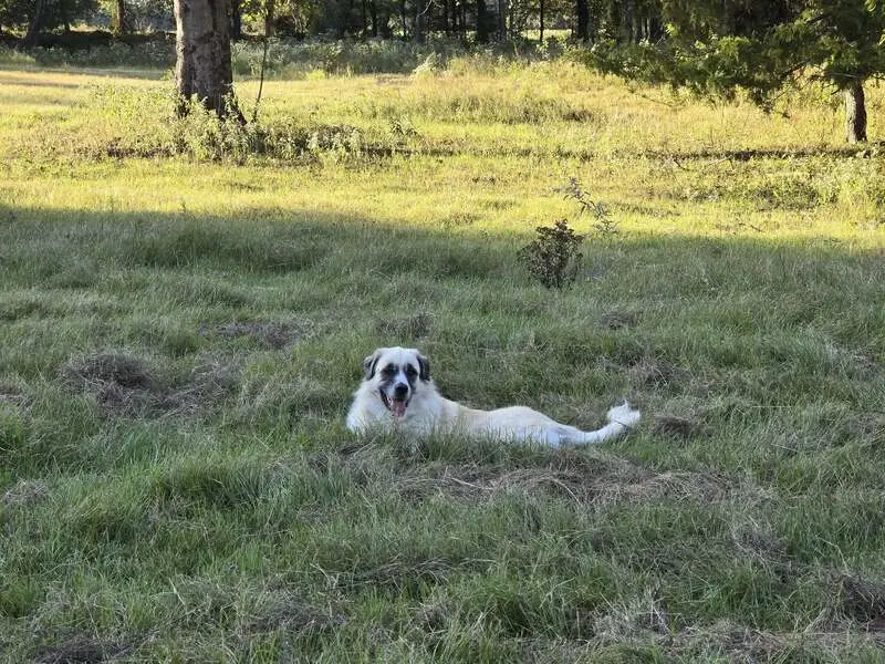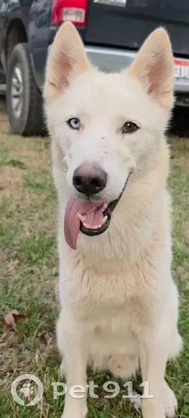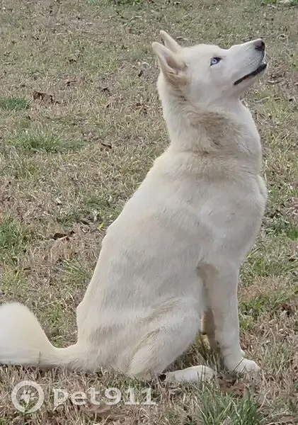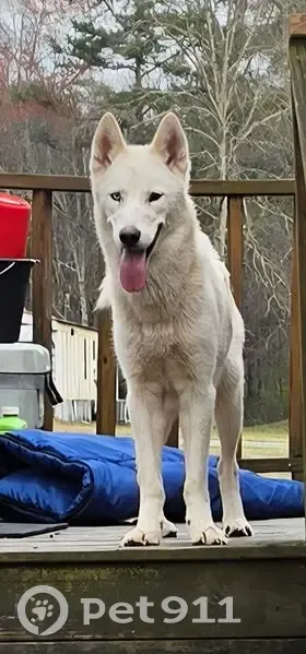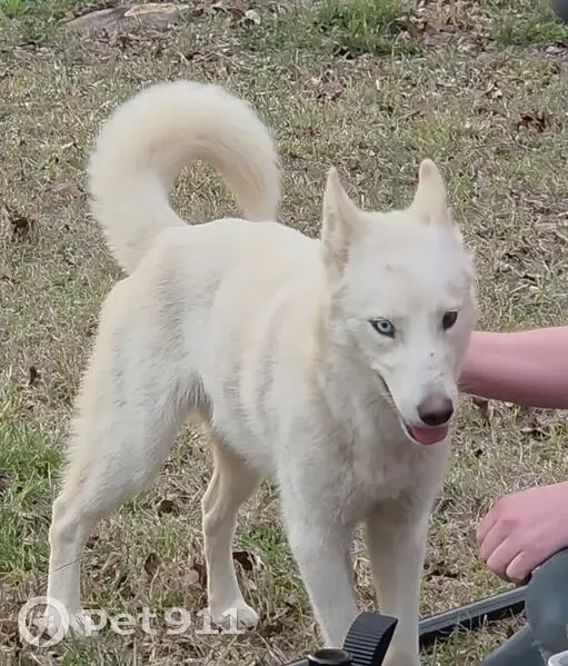 White, energetic and talkative huskie. Some dominantbehavior. Not great with cats. Young, I'd say a year or less. When it showed up it was VERY thin. We are feeding it and making sure it has water but can't keep it or bring it in as we have our own animals. We will be checking for microchip asap.
