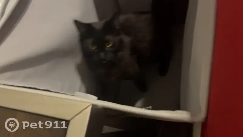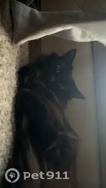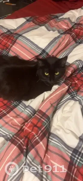 Black with grey spot on underside and a white spot on chest, fluffy, yellow/green eyes, Hot Pink collar, microchipped, got spoked by smoke alarm and ran out of house