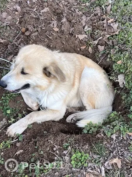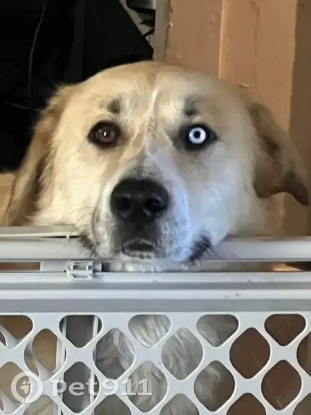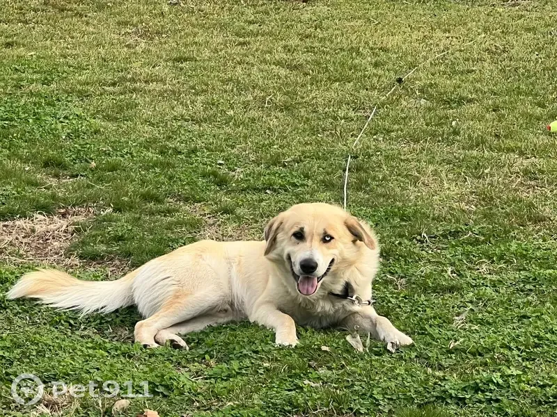 Golden color. No collar as he slipped off and got away. While being outside for potty. On lead rope. Very sweet boy. Was given by previous owner who couldn’t keep him due to him running off. And previous owner wanted him to have a family which he could not give. Have had him for maybe 3-4 months now. Wants to play and cuddle. I call him by caiman or CayCay.
