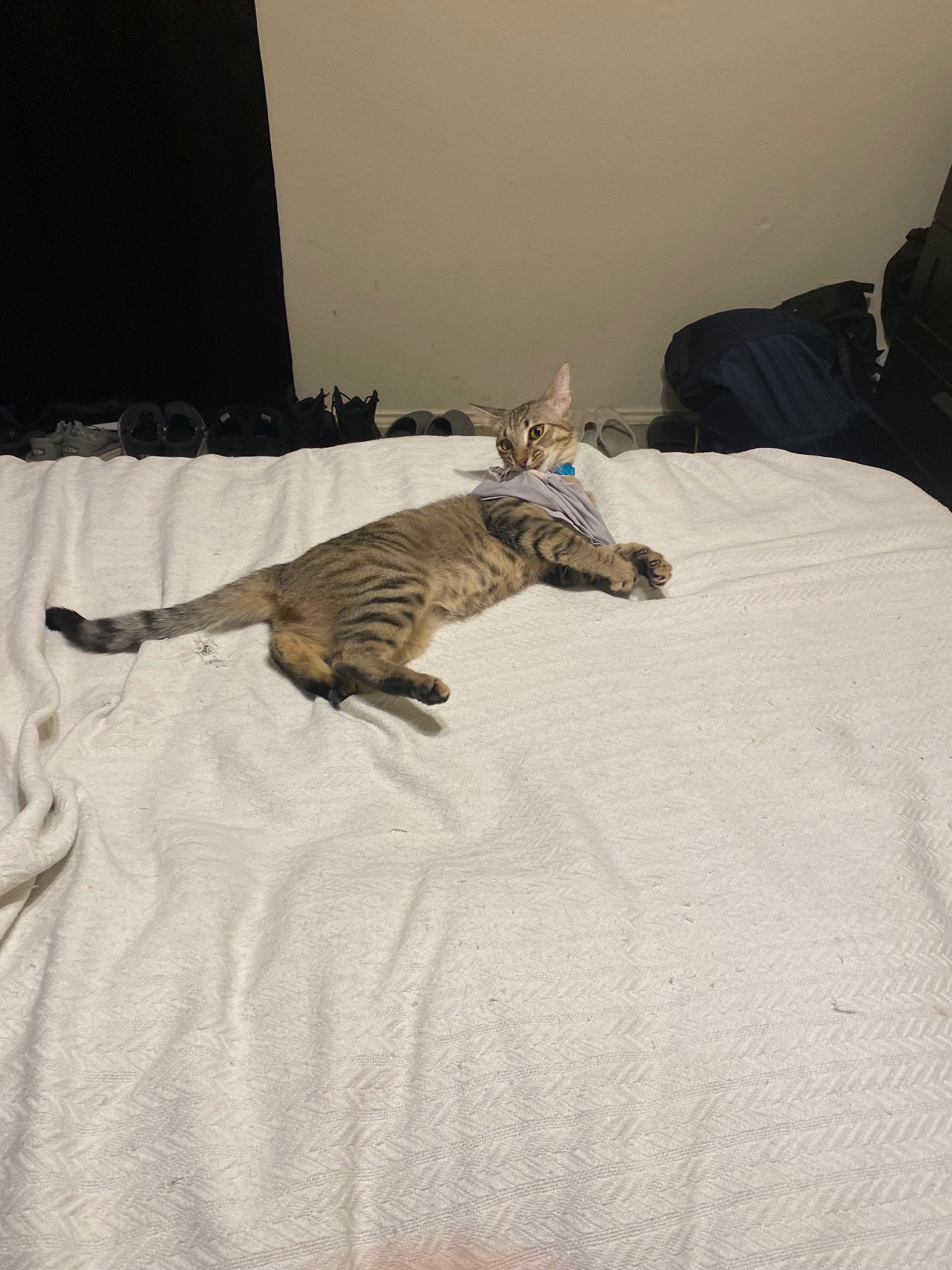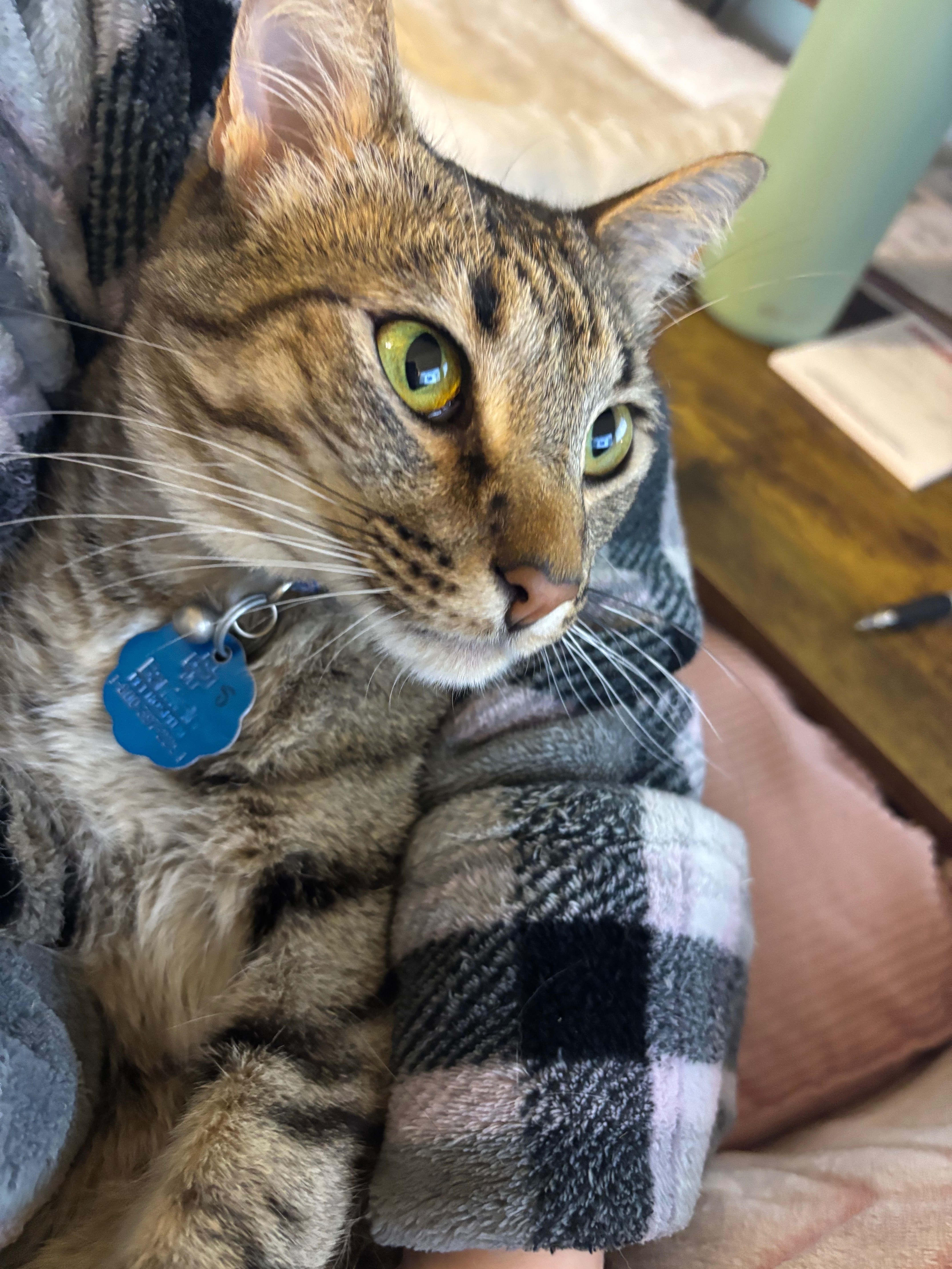 He’s a light brown tabby with some black stripes. He is generally quiet but can be very loud when he meows. He was wearing a dark blue collar with a bell and his rabies tag when he got out. He’s a loving cat but is shy and skittish. He got out on the 28th. We saw him in our backyard on the 31st but he was scared and ran through our neighbors yards when I opened the door to try to get him inside. He’s not likely to come up to anyone he doesn’t know. But he could be hiding in someone’s yard that has a shed or something to hide in or under. Please let me know if you’ve seen him.