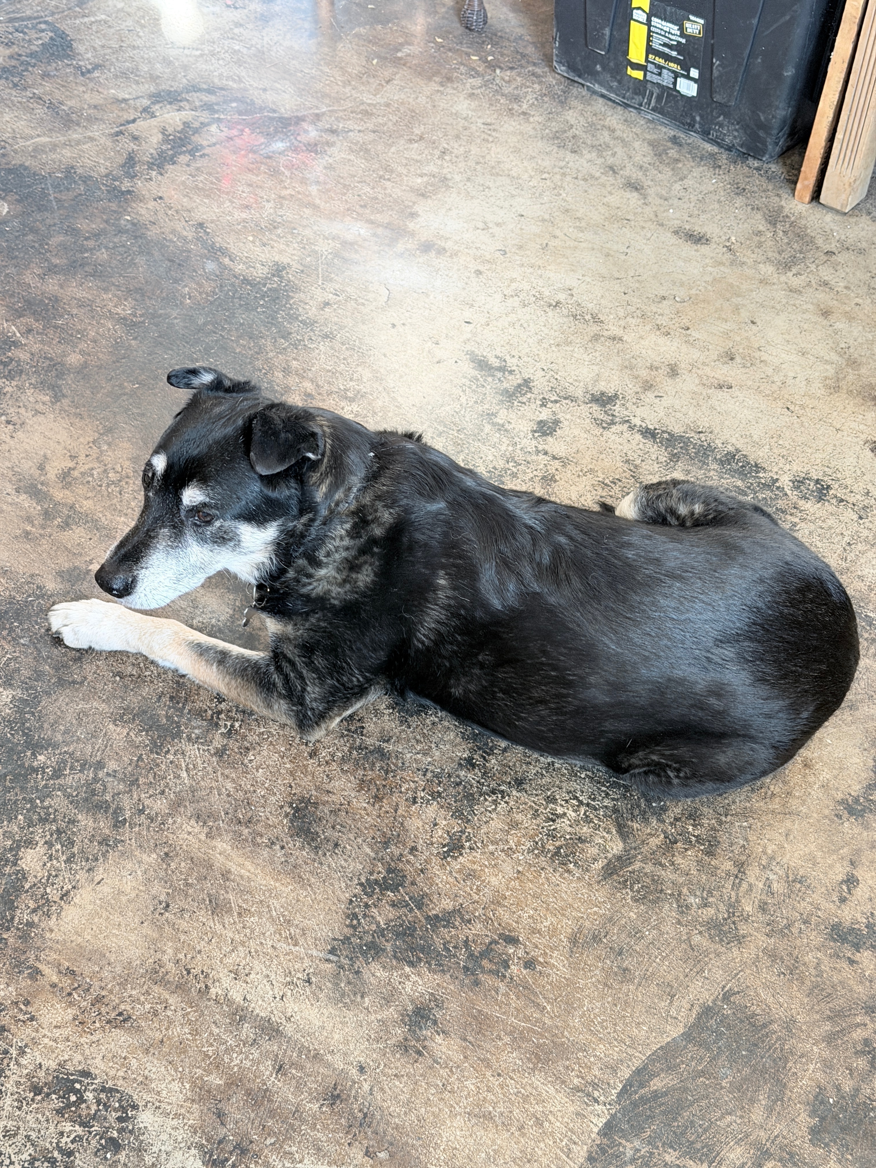 Lab mix, looks black but is dark brindle. Has...