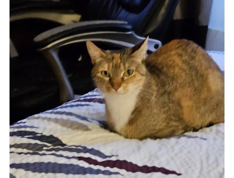 She is a brown tabby with a medium coat and tufts of hair on the tip of her ears. White on the chin/neck, stomach & paws . She is very thin and I believe young , less than a year. She is in heat. Wearing a pink flea collar. Very friendly.