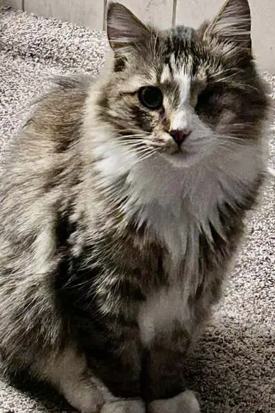 Grey coat with white features, blue collar with silver bell, very friendly. She was walking in the grass by a dirt road, she came to us when we got out of our car