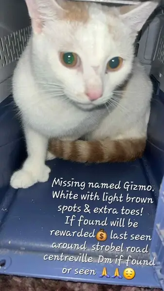 White with orange/peach colour. Blue eyes. He is very friendly, sweet and talkative. When I found him he was very distressed and was behind a garbage bin.