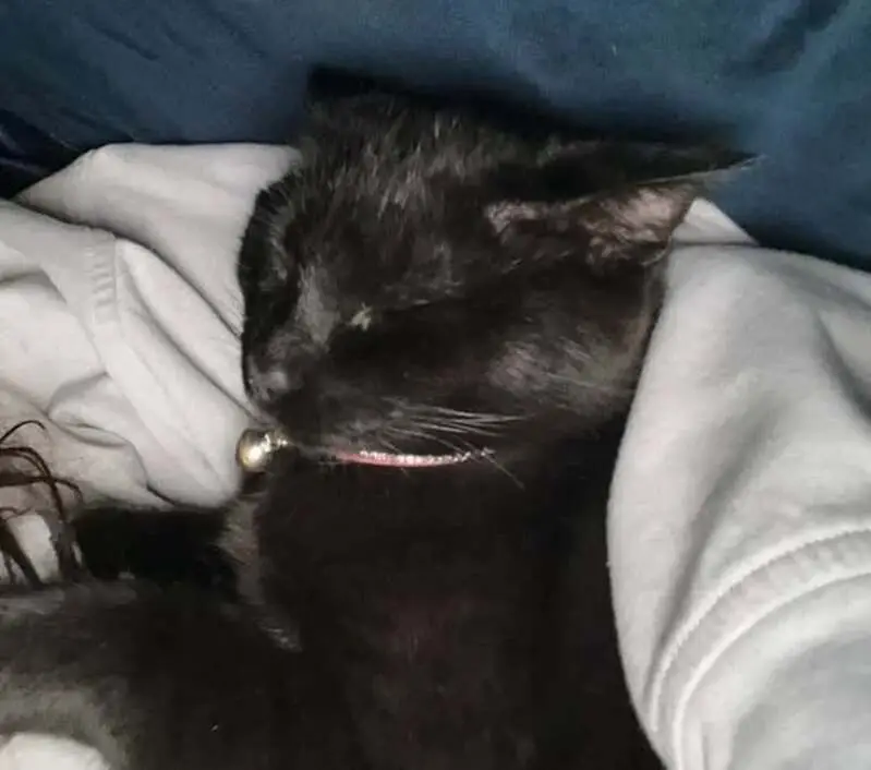 Female Black Cat with a white spot on her chest. Yellow eyes. She is really friendly and behaved so I guess she is not stray.