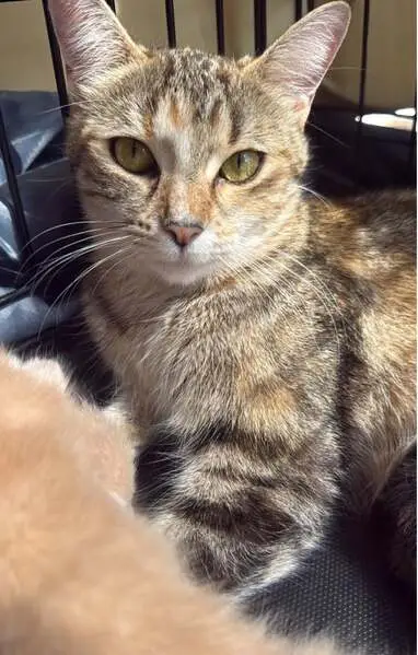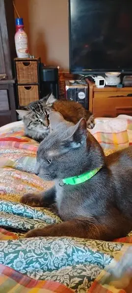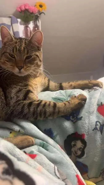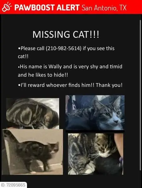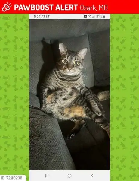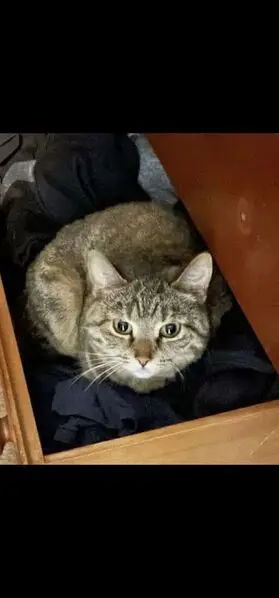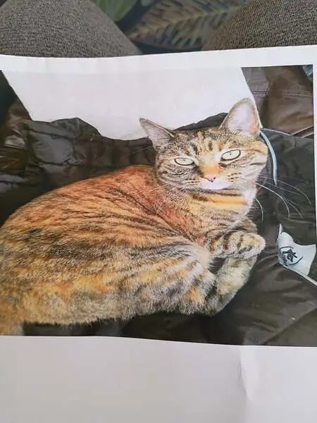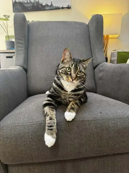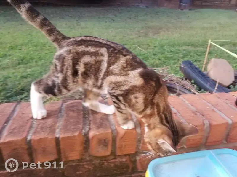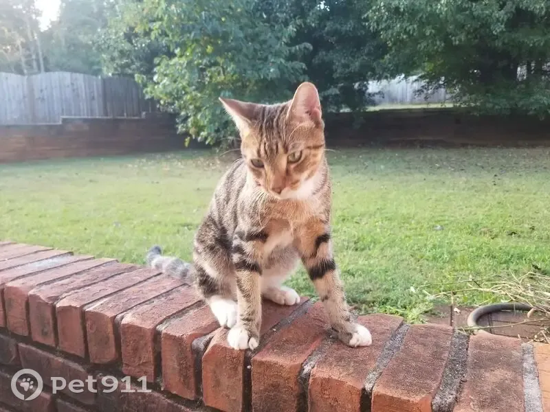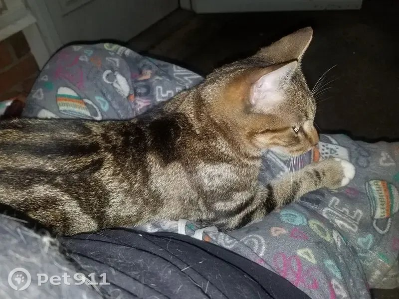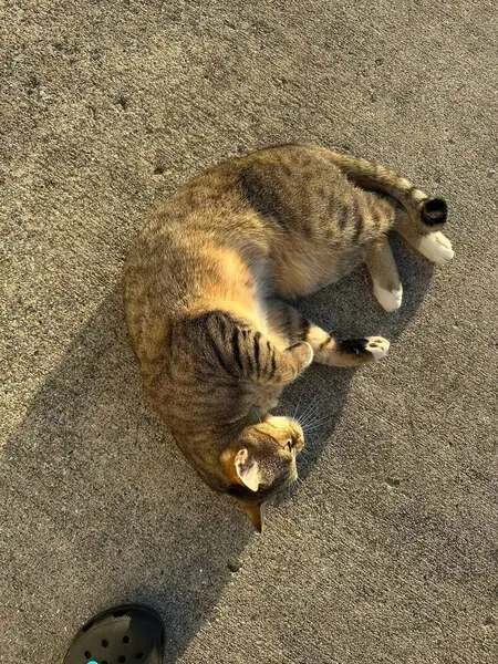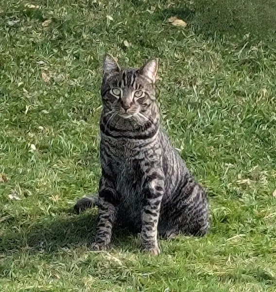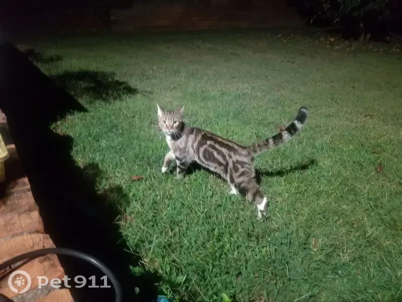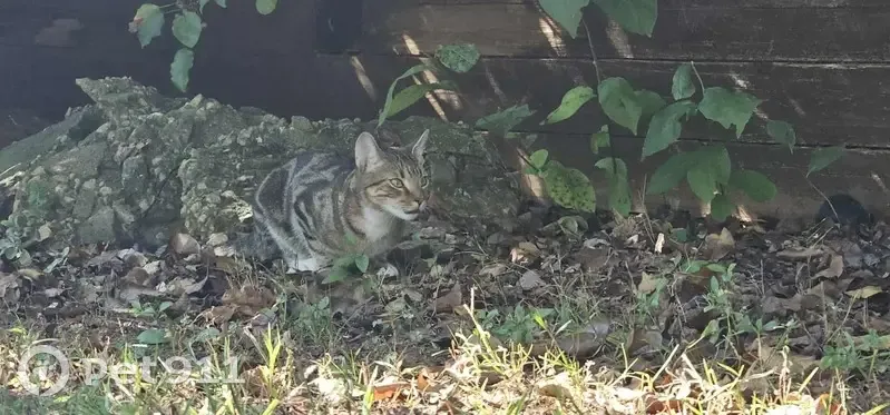 Smoky brown male Tabby. White paws, white whiskers, brown nose, spotted paw pads. Big rings on tail. Dark stripes down back. Not neutered. Very sweet. He approached me in my yard. Wanted a lot of petting and attention. Follows me around.