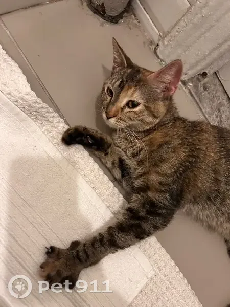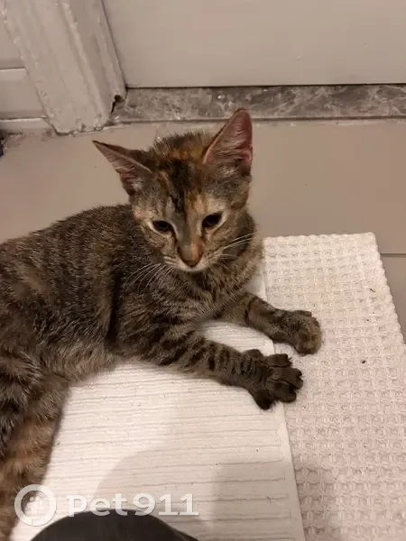 Brown, black and orange stripes. On the smaller side. Very friendly and cuddly. She was stuck behind a gate. I let her out and she followed me into my house.