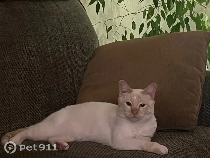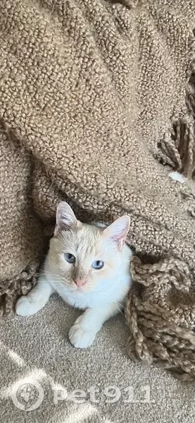 FEMALE Approximately 12 months Cream/white with light caramel ears, tail, blue eyes. Very thin and dehydrated when found in front of house. Vet visit indicated she was previously spayed but not microchipped.