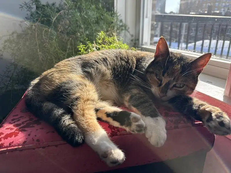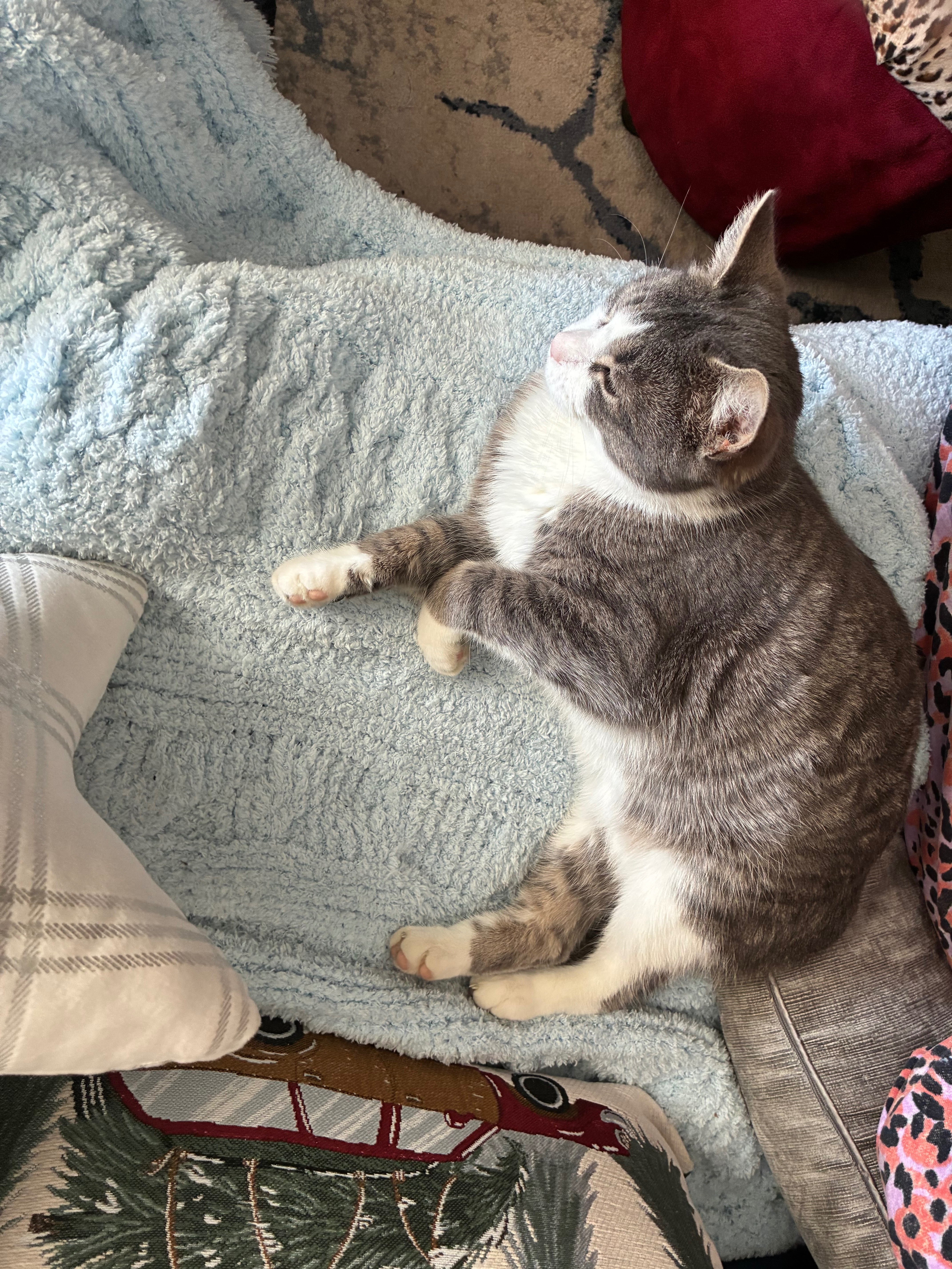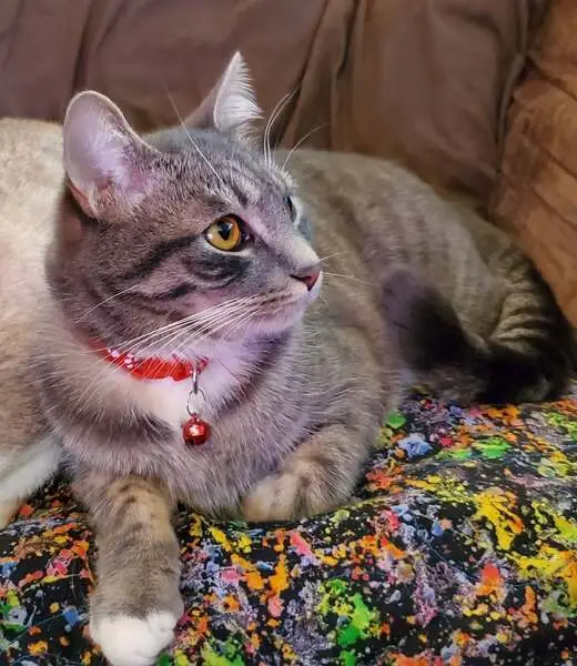 Grey and white. We took her in out of the cold for the past month. Leaving for Florida in a few days and need to get her to a good home