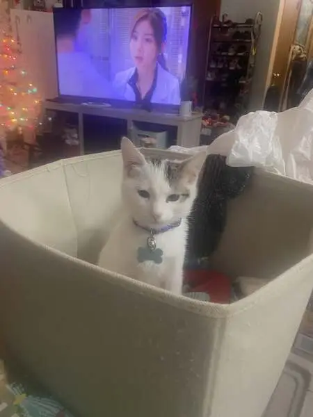White cat, with black ears and temples, black tail, black spot on right upper hind leg, black spot on lower right front let. Kitty is very friendly, looks healthy.