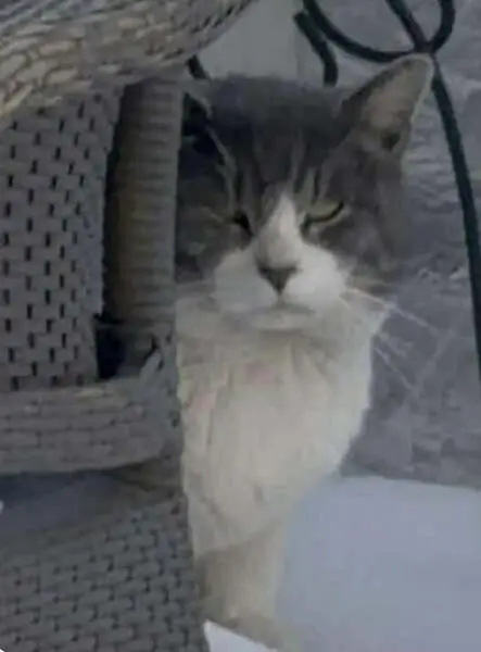 Last seen: 6900 Clinton Rd, Upper Darby, PA, (Clinton Rd & Walnut St) Behavior: Very friendly and responds to the sound of canned food. Description: Gray and white cat. His most distinctive feature is two dark spots on his nose.
