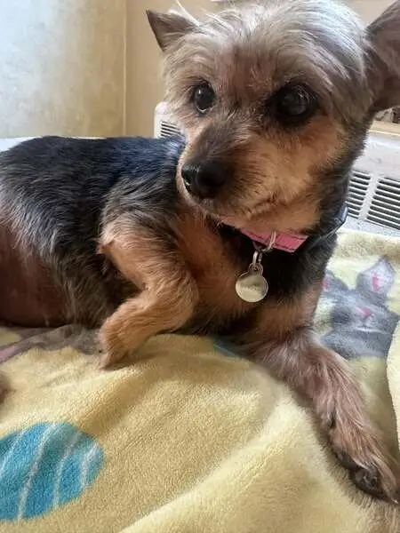 Boy dog. Very sweet. Gentle. No color. He has the face of a Yorkie but is aa little bit bigger than one. He has a chip. But no one is answering the phone.