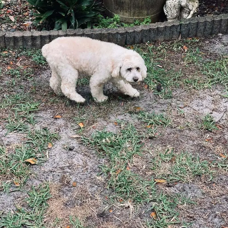 White small male dog with red coatings (as if dirty). Has an underbite. Is calm and very well behaved. We found him outside of Dana’s Pampered Pets on Weddington Rd. He is in good condition, a very healthy dog.