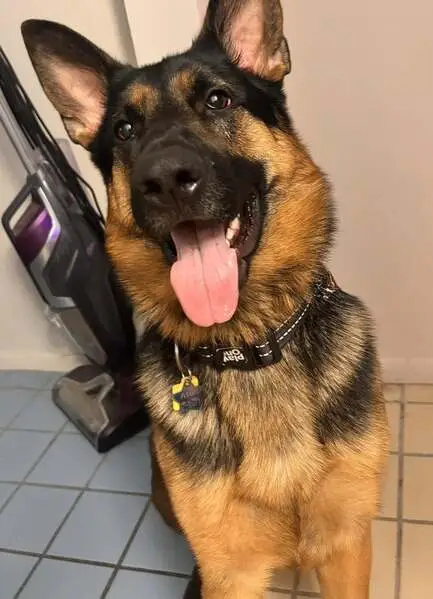 Pelaje abundante marrón y negro un ojo azul y el otro marrón amigable tiene un collar con código QR con el resto de su información