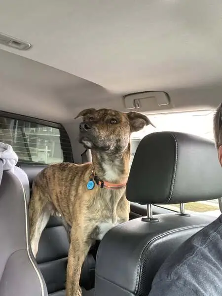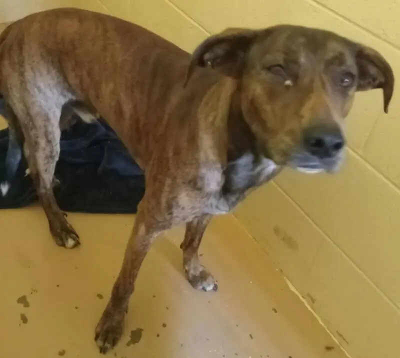 Short haired brindle. Long legs, young. She was found running down the highway. No color and had been attacked by something, lots of wounds. She has been seen by a vet for them and treated.