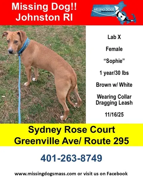 Brown clean coat with white spot on chest, black around eyes, a mom at some point, recently trimmed nails. Sweet dog, medium size.