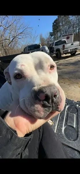 White with brown spots on ears and black spots on body, female, very sweet and definitely trained. She was walking through my back garden and came right up to me.