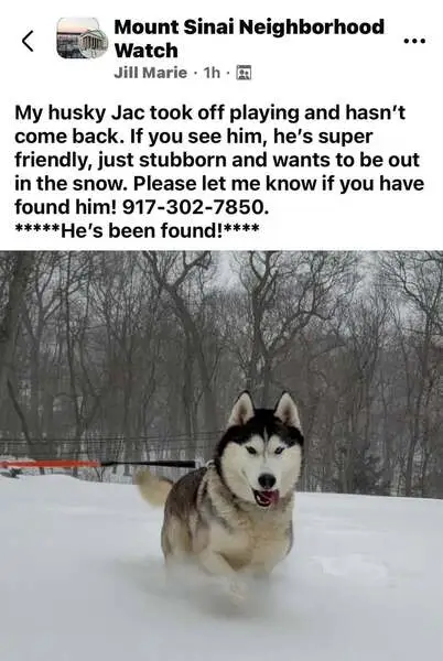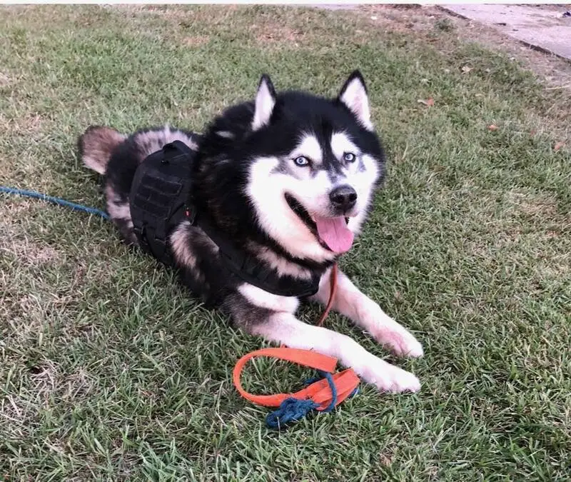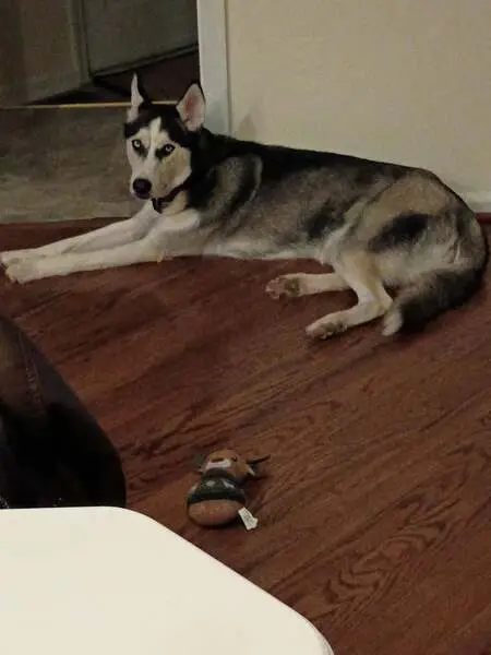 Light blue collar. Friendly, howls when left in a room by herself, top if her tail has black stripe running down her tail, underside of her tail is all white